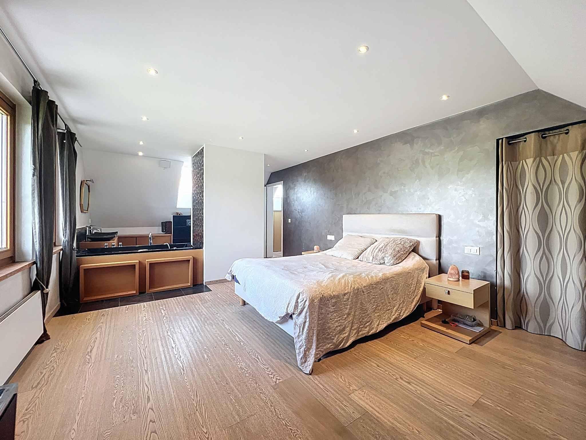 Das Haus mit 250m² Wohnfläche + Keller + ausgebautem Dachgeschoss verfügt über 5 Schlafzimmer, darunter die Master-Suite mit angrenzendem Badezimmer (Badewanne + italienische Dusche). 2 Badezimmer vervollständigen den Schlafbereich.
