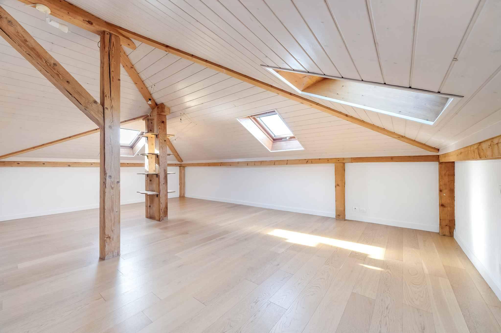 Diese im Dachgeschoss mit Aufzug gelegene Wohnung mit einer Wohnfläche von ca. 84 m² besticht durch ihren einzigartigen Charakter und ihr Cachet, das durch die verschiedenen Deckenhöhen, die sich an die Linien des Daches anpassen, subtil hervorgehoben wird.
