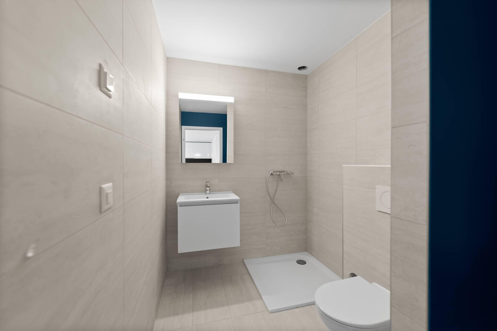 La partie nuit, comprend 1 chambre, une salle de douche avec emplacement pour colonne de lavage et un WC séparé. Toutes les pièces de l’appartement bénéficient d’un accès direct à la terrasse de 40m² et au jardin de 26 m².