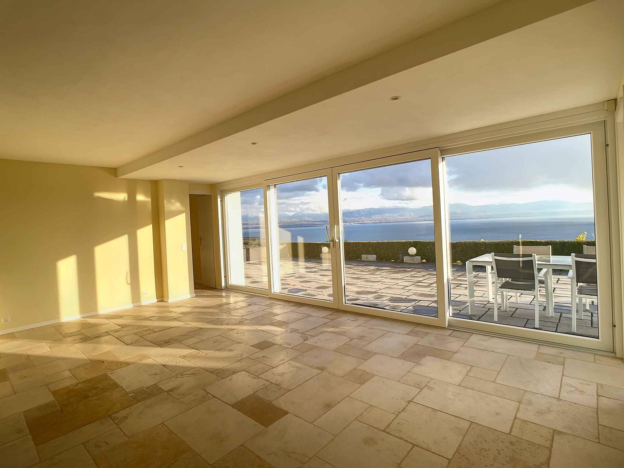 Toutes les pièces ont accès à une spacieuse terrasse orientée plein sud qui offre une vue panoramique sur le lac.