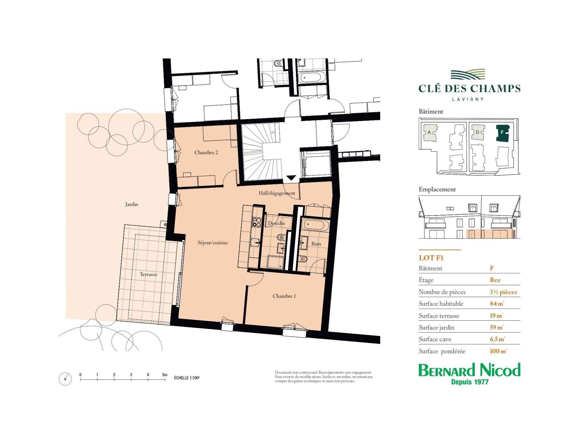 Cet appartement de 3.5 pièce se situe au rez-de-chaussée du bâtiment F et se compose comme suit :