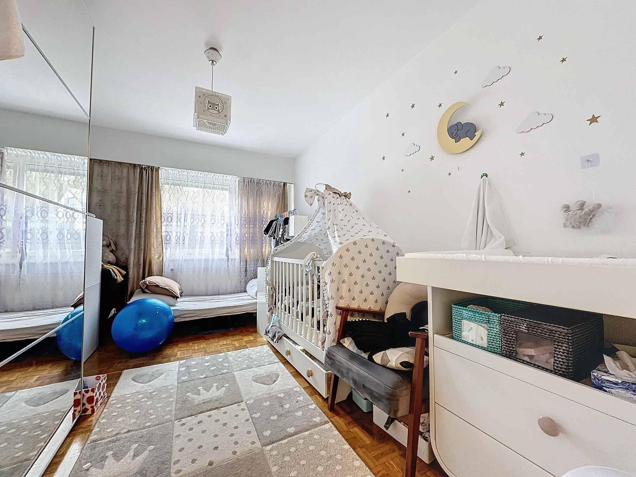 La partie nuit est séparée et comprend deux chambres, un couloir avec de grandes armoires murales, une salle de bains et un WC visiteurs.