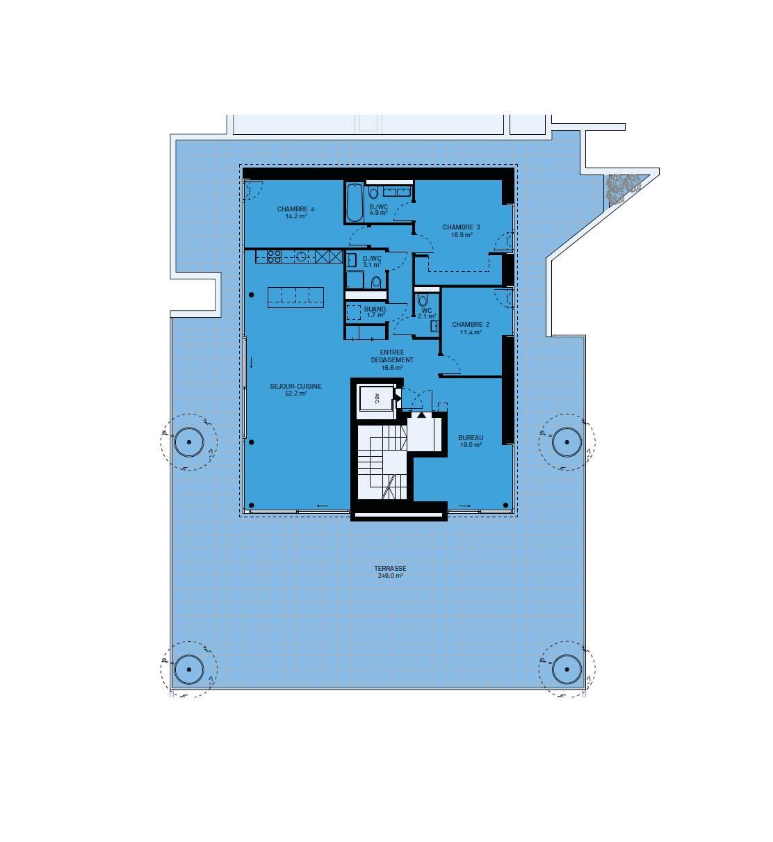 Accès directe en ascenseur dans le hall de l'appartement, qui comprend des armoires murales, un grand séjour / cuisine ouverte de plus de 52m2, une salle de douche, un WC séparé, trois chambres à coucher dont une chambre parentale avec salle de bain attenante, un bureau, une buanderie avec arrivées d'eau pour la colonne de lavage. Toutes les pièces de l'appartement ont accès au rooftop terrasse. L'appartement se situe à l'extrémité du côté sud du bâtiment et est complétement entouré par sa terrasse rooftop. Une cave complète ce bien.