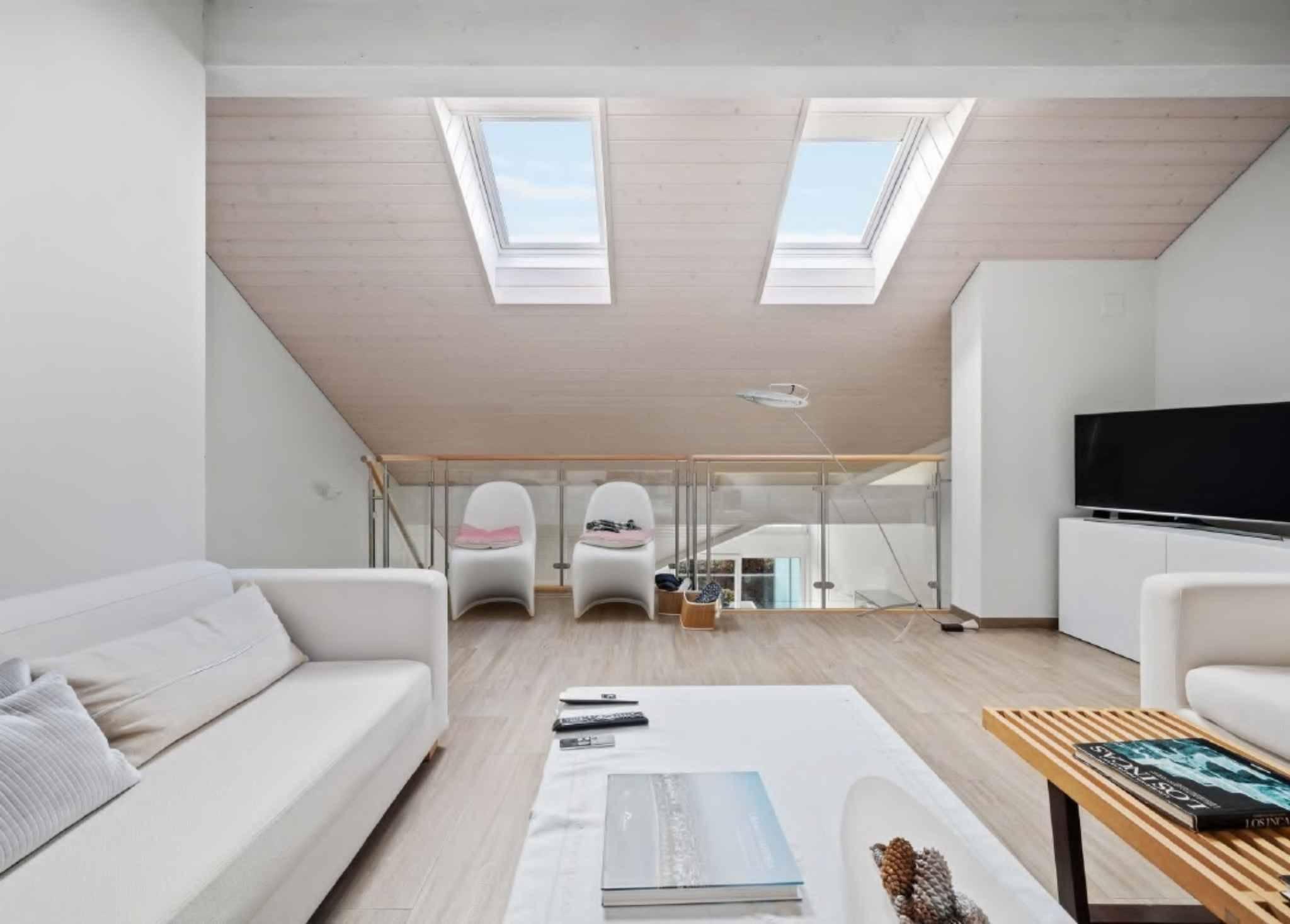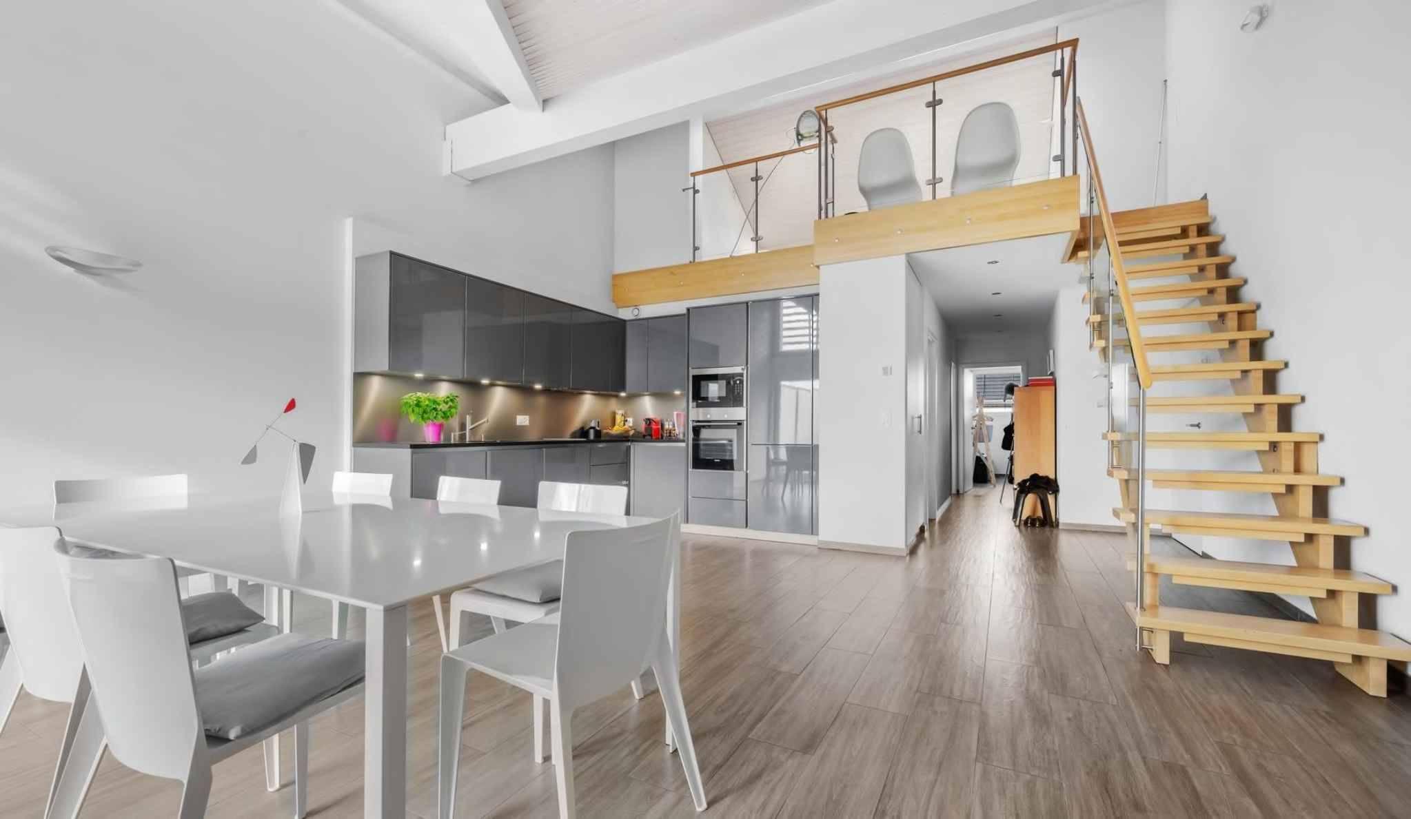 De plus, un bel escalier nous accompagne dans une grande mezzanine actuellement agencée en salon mais qui pourrait également faire office de troisième chambre.