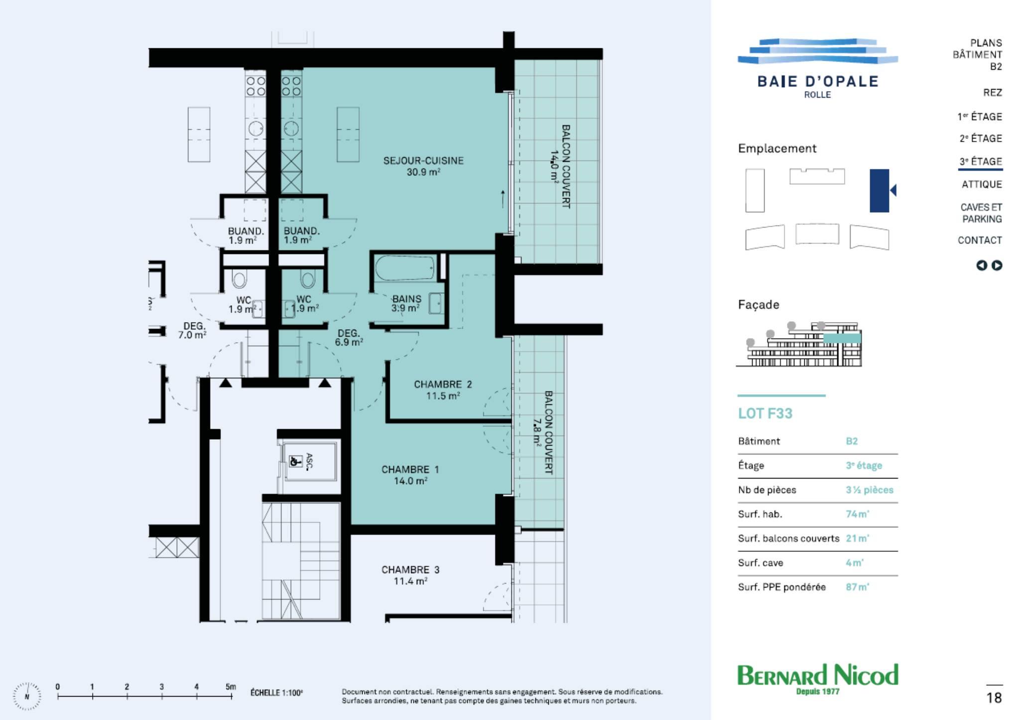 Sis au 3ᵉ étage sur 4 d’un immeuble moderne avec ascenseur, il profite d’une orientation Est, offrant une belle luminosité matinale et un confort agréable au quotidien.