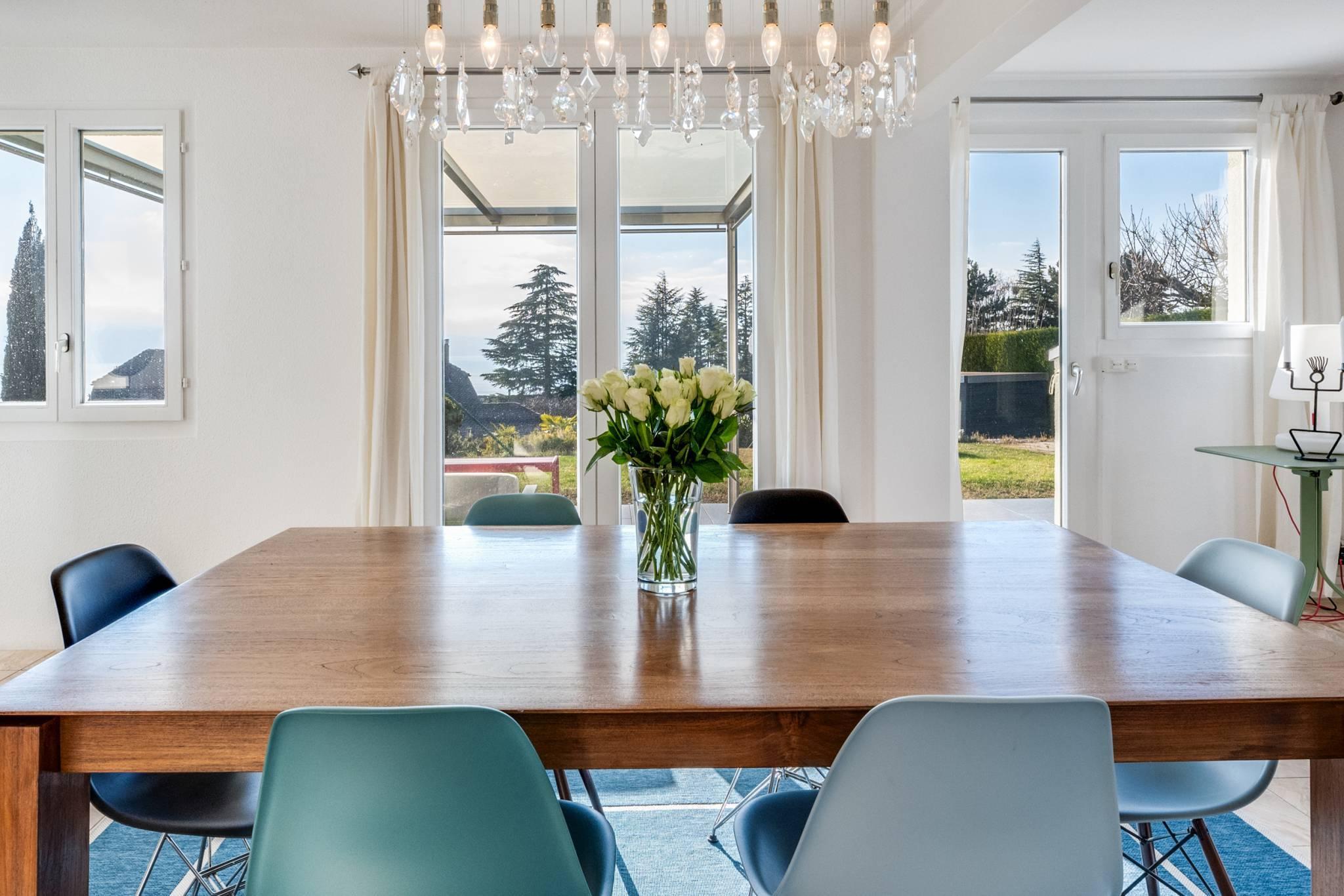 A l'étage, 5 chambres baignées de lumière et bénéficiant d'une magnifique vue sur le lac et les montagnes ainsi que 2 salles d'eau et une terrasse.Le sous-sol, entièrement aménagé et chauffé, est composé d'un salon, une salle d'eau ainsi qu'un grand bureau très lumineux (plusieurs baies vitrées).