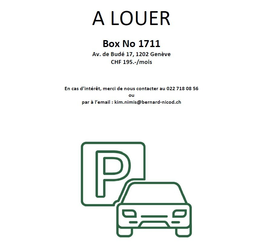 Photos Voir tout Détails Nature de l'offre Location Étage Floor -1 Référence Ref object 1711 Loyer CHF 195.- Charges CHF 0.- Emplacement 1202 Genève, Avenue de Budé 17 Géolocalisation Description Calculer votre prime Biens à proximité Image Adresse Chavannes-de-Bogis Bureau de 300m2 divisibles situés en Terre Sainte CHF 267.- Image Adresse Chavannes-de-Bogis Beaux bureaux divisibles idéalement situés CHF 256.- Image Adresse Bernex 5 pièces Superbe appartement avec sous-sol indépendant à Bernex CHF 1'650'000.- Image Adresse Chavannes-de-Bogis Bâtiment Artisanal neuf CHF 200.- Image Adresse Genève 4 pièces Magnifique Appartement de 4 pièces au Petit-Saconnex CHF 1'700'000.- Image Adresse Meyrin 5 pièces Meyrin - Appartement de 5 pièces – Entièrement rénové CHF 1'280'000.- Image Adresse Chavannes-de-Bogis Bureaux de 300 m2 idéalement situés CHF 276.- Image Adresse Genève 4 pièces Appartement de standing avec vue exceptionnelle! CHF 5'850'000.- Image Adresse Mies 9 pièces Un objet exclusif et rare sur le marché, aux portes de… CHF 8'000'000.- Image Adresse Eaux-Vives 10 pièces Sublime maison de ville dans un écrin de verdure CHF 7'900'000.-