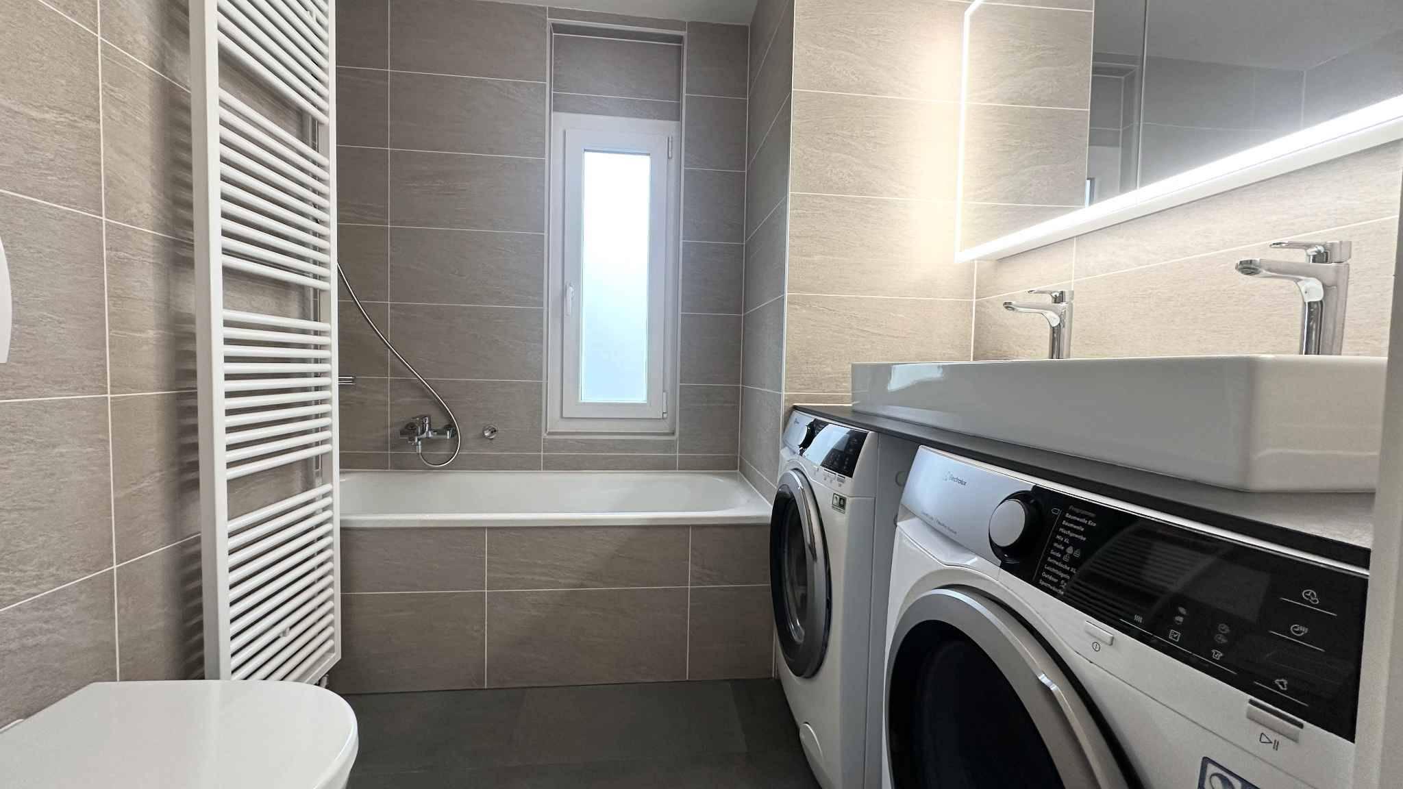 Une salle de bain/WC équipée d’un lave-linge et d’un sèche-linge (laissés à bien plaire)