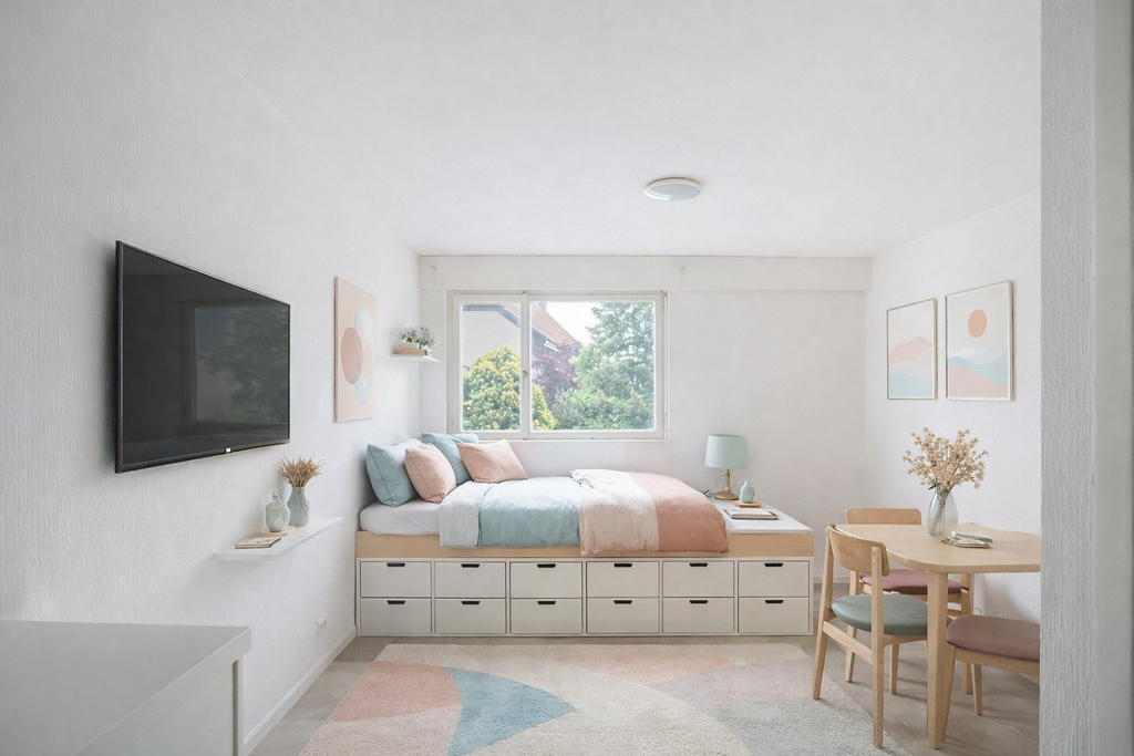 Ce bien comprend une cuisinette, un séjour/chambre à coucher, une salle-de-douche/WC et une cave.