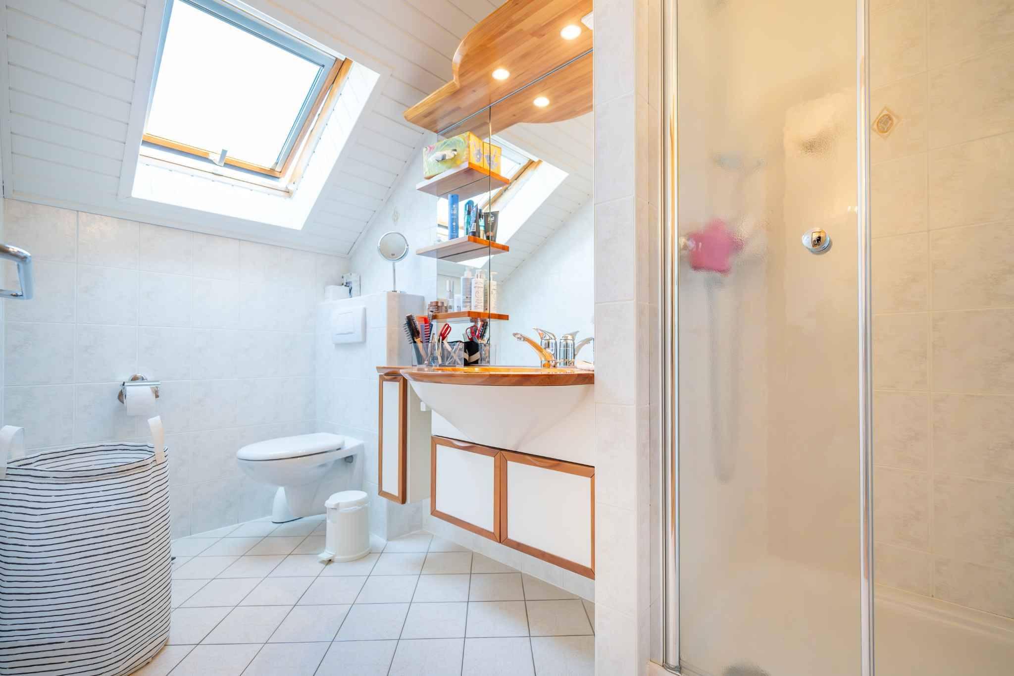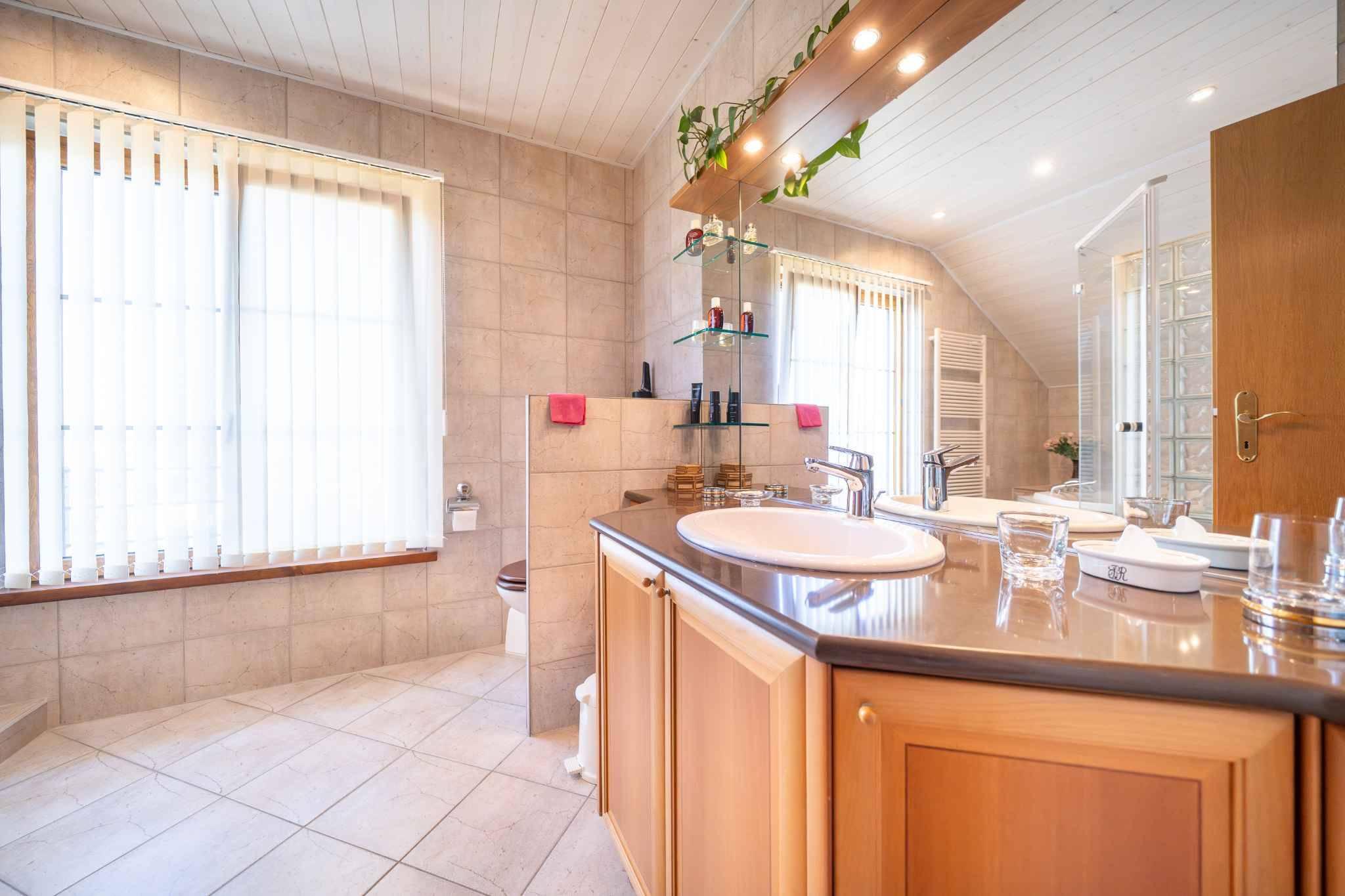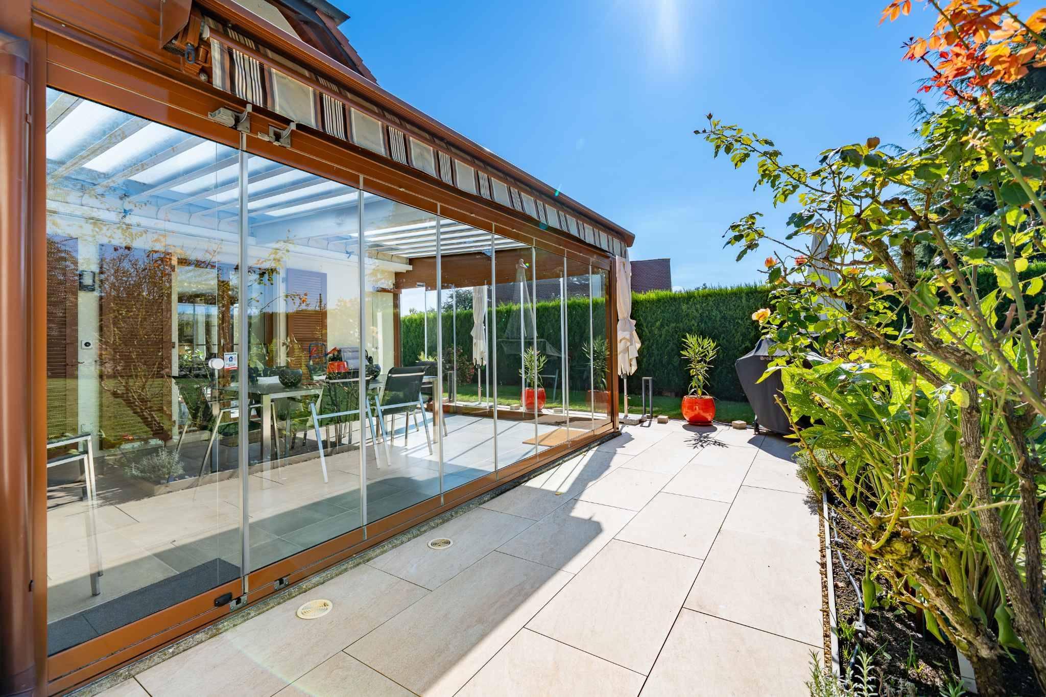 Rez-de-chaussée : Une belle entrée s’ouvre sur un vaste hall de distribution menant à un double séjour avec cheminée, à une cuisine partiellement ouverte sur la salle à manger ainsi qu’à une véranda lumineuse. Un espace avec armoires murales et des WC visiteurs complètent ce niveau. Toutes les pièces offrent un accès direct à l’extérieur.