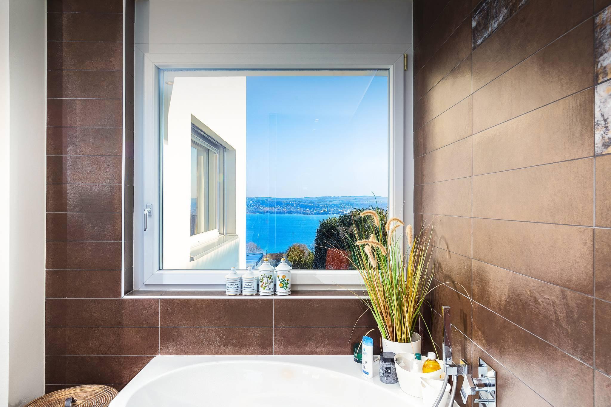 Le rez-de-chaussée :Une entrée majestueuse avec deux escaliers donnant accès à l'étage supérieur, un grand séjour double avec de grandes baies vitrées, un espace aménageable en coin TV/home cinéma avec sound system, une salle à manger et une cuisine séparée entièrement agencée avec îlot central et cellier. Toutes les pièces de vie ont un accès direct à la terrasse et offrent une vue imprenable sur le lac et les Alpes. Un vestibule avec armoires murales, WC séparés et une première chambre à coucher en suite avec salle de douches/WC privative complètent ce niveau.