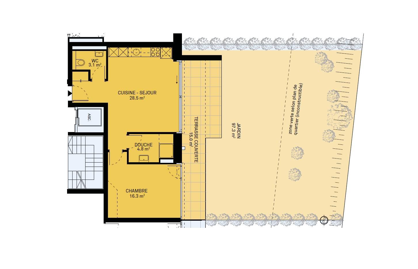 Un hall d'entrée avec armoire murale, un séjour / cuisine ouverte de plus de 28m2 avec accès à la terrasse de 15m2 et au jardin de 97m2, une chambre à coucher avec également un accès extérieur, une salle de douche, un WC séparé.