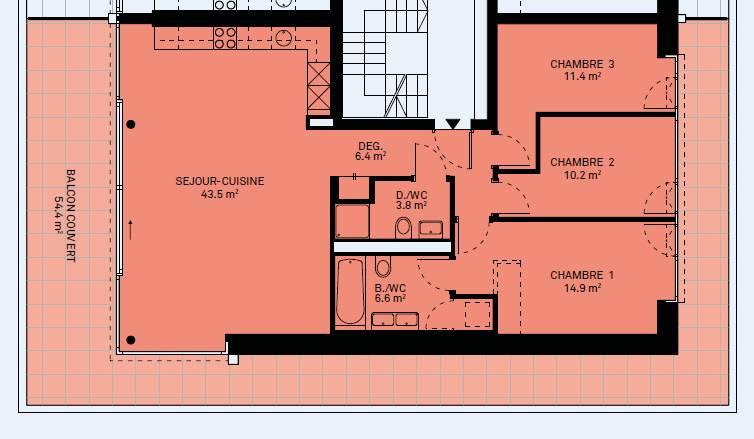Un hall d'entrée avec armoire murale, un séjour / cuisine ouverte de plus de 43m2 donnant accès à un balcon couvert de 54m2, une salle de douche, deux chambres à coucher et une chambre parentale avec une salle de bain attenante avec arrivées d'eau pour la colonne de lavage. Toutes les pièces de l'appartement ont accès au balcon. Cet appartement se situe à l'extrémité sud du bâtiment et le balcon borde le logement. Exposition ouest, sud et est. Une cave complète ce bien.