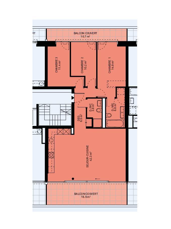 Un hall d'entrée, un séjour / cuisine ouverte de plus de 42m2 donnant accès à un balcon couvert, une salle de douche, deux chambres à coucher et une chambre parentale avec salle de bain attenante avec arrivées d'eau pour la colonne de lavage. Les trois chambres donnent accès à un second balcon couvert. Une cave complète ce bien.
