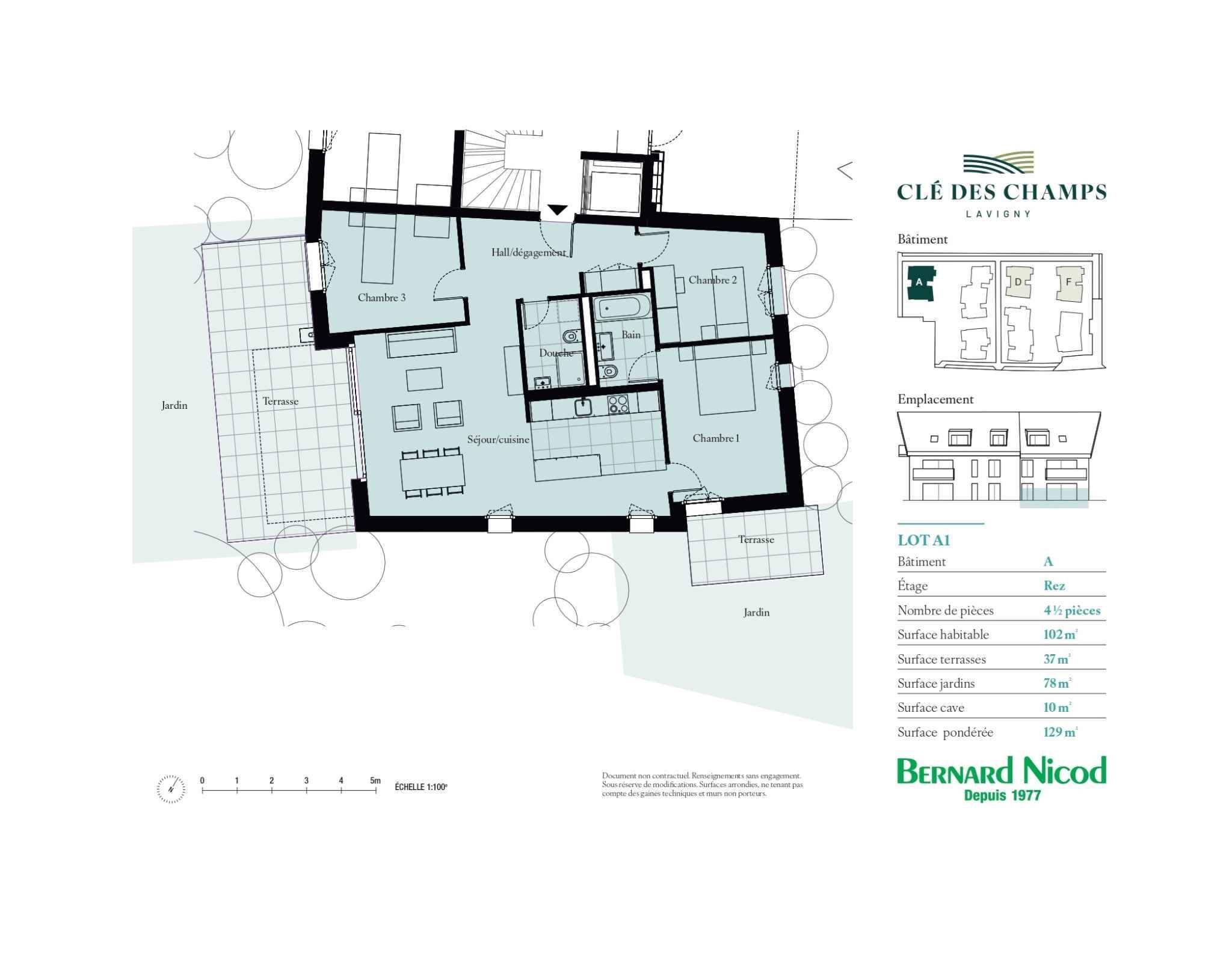 Cet appartement de 4.5 pièces se situe au rez-de chaussée du bâtiment A et se compose comme suit :