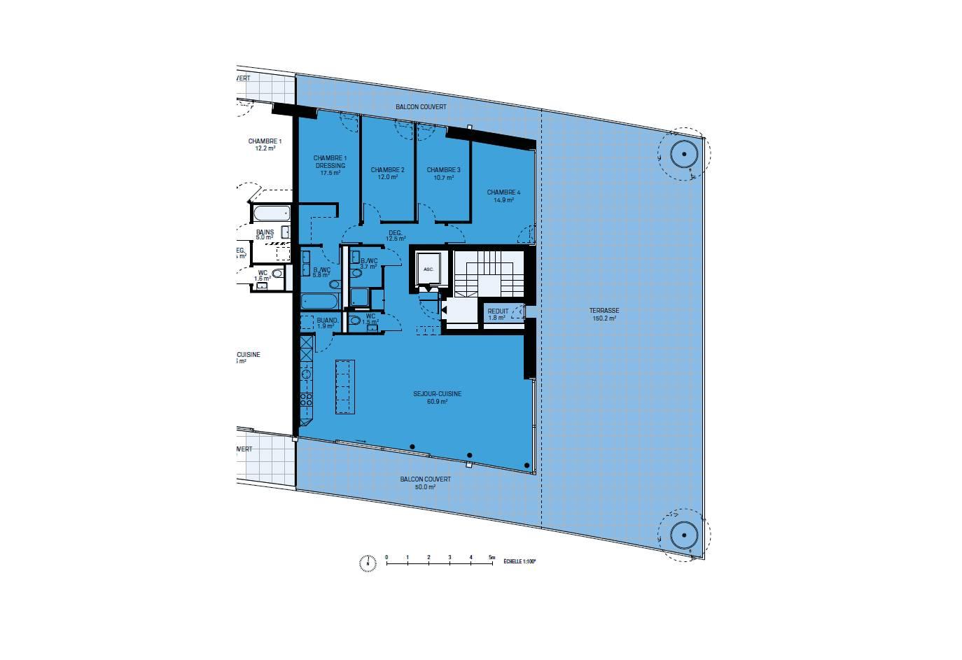 Un hall d'entrée avec une armoire murale desservi directement en ascenseur, un séjour / cuisine ouverte avec îlot central de plus de 60 m2 avec accès au balcon couvert et à la terrasse, une salle de douche, un WC séparé, un couloir mène à la zone nuit avec trois chambres à coucher et une chambre parentale avec une salle de bain attenante et un dressing. Les quatres chambres ont accès aux extérieurs. Une buanderie avec arrivées d'eau pour la colonne de lavage. Un réduit.