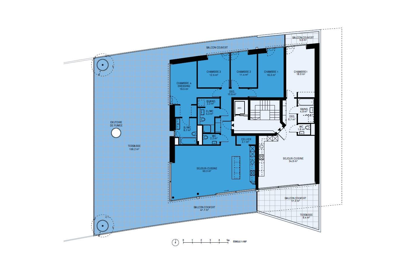 Les appartements du rez-de-chaussée ont un jardin privatif et tous les logements bénéficient de terrasses ou balcons. 11 attiques avec vue panoramique et des rooftop terrasses offrent jusqu’à 249m2 de surface pondérée.
