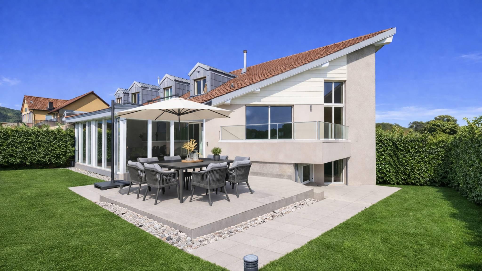 Située dans un quartier résidentiel discret et recherché, cette élégante villa d’environ 285 m² habitables séduit par sa luminosité, ses volumes généreux et ses vues imprenables sur le lac Léman et la chaîne du Mont-Blanc.