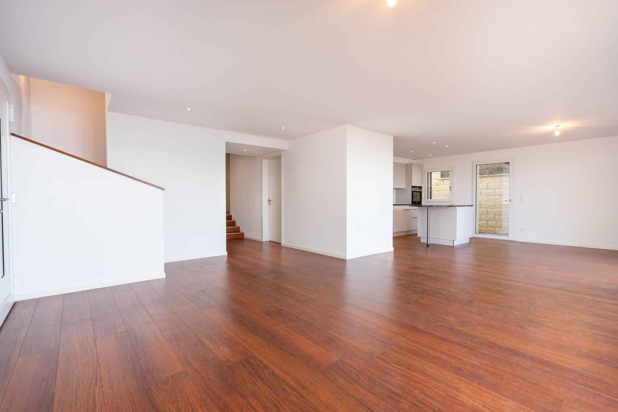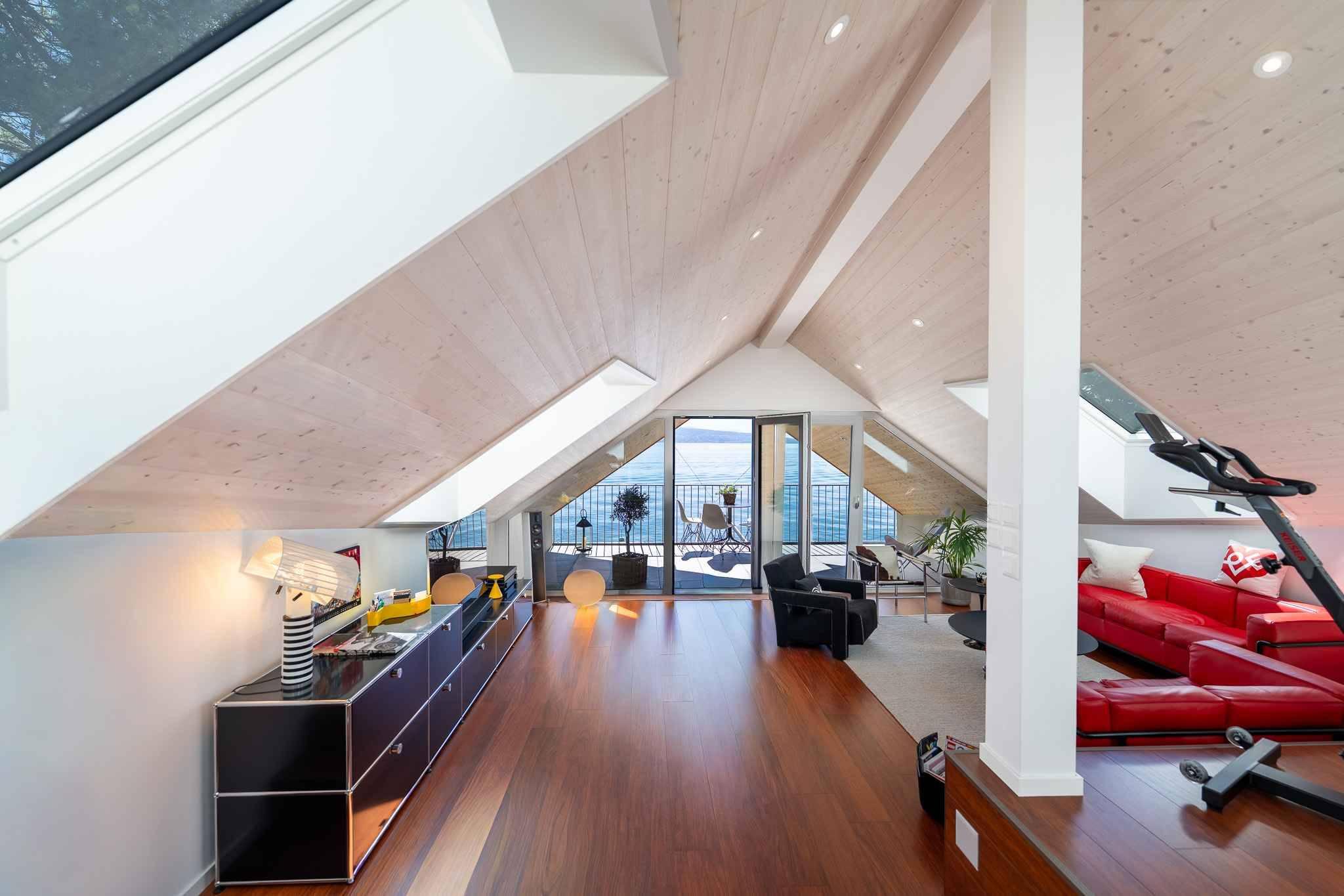 Le duplex de 5.5 pièces :Ce duplex, accessible directement par un ascenseur privatif, comprend une grande pièce de vie lumineuse donnant sur le jardin avec une magnifique vue sur le lac et les montagnes. Une cuisine équipée d'un ilot central et d'un garde-manger, avec un accès direct à l'extérieur.Une chambre/bureau, une salle de cinéma, une salle de bain et un espace buanderie complètent ce niveau.