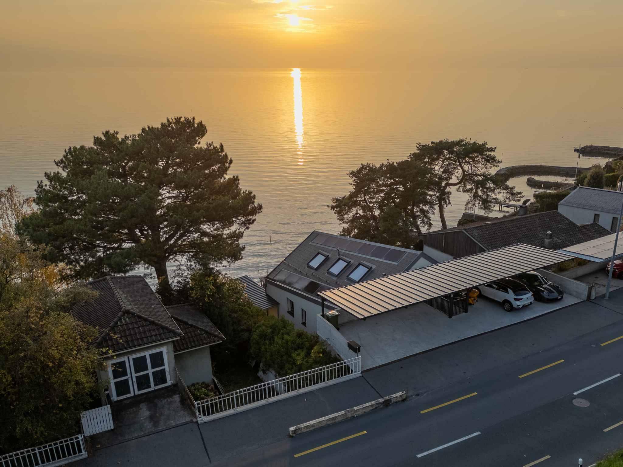 Située en première ligne du lac cette propriété récemment construite se compose de deux appartements en duplex. Elle offre une superficie habitable de 290 m² répartie sur 8.5 pièces, avec accès direct au lac, un ponton privé, une place d'amarrage ainsi qu'un abri pour bateau.