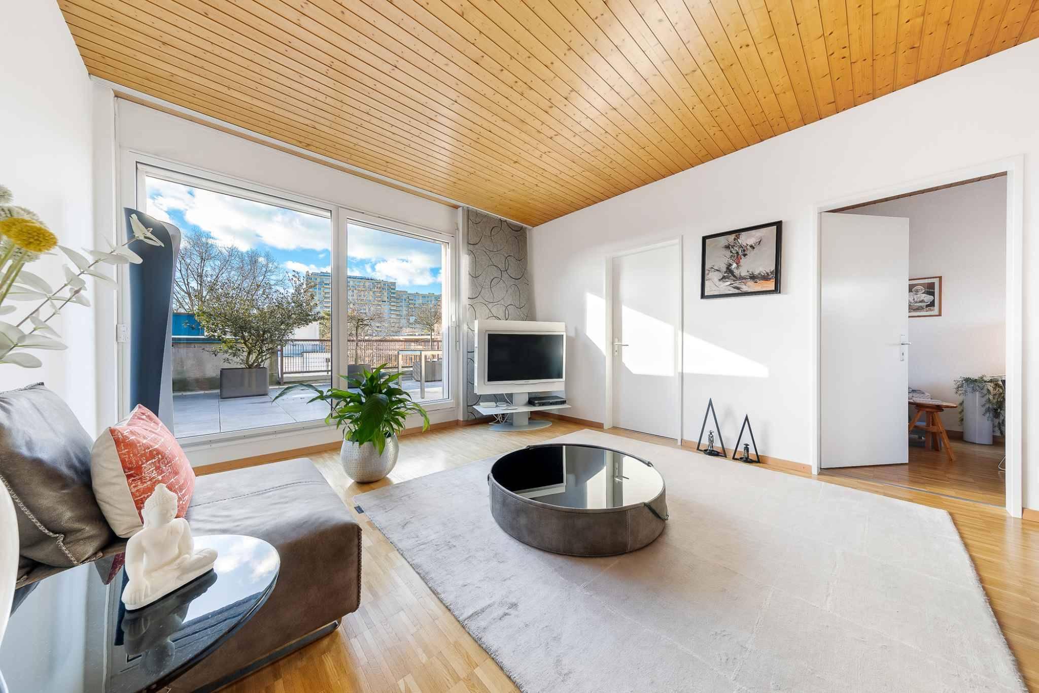 Idéalement situé dans un quartier résidentiel calme et très recherché de Thonex (Rive Gauche), à proximité immédiate des commerces, écoles et transports, ce superbe duplex de 6 pièces occupe l’avant-dernier et le dernier étage d’un immeuble de standing construit dans les années 90, sans ascenseur.