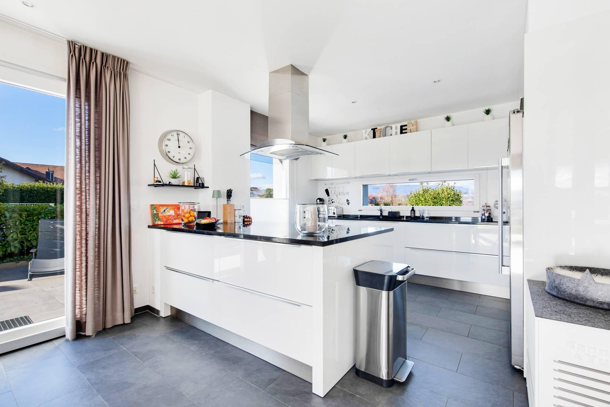 - Hall d’entrée avec placard, un WC visiteurs et une cuisine moderne avec ilot centrale ouverte sur un vaste séjour baigné de lumière, avec accès direct à la terrasse et au jardin.
