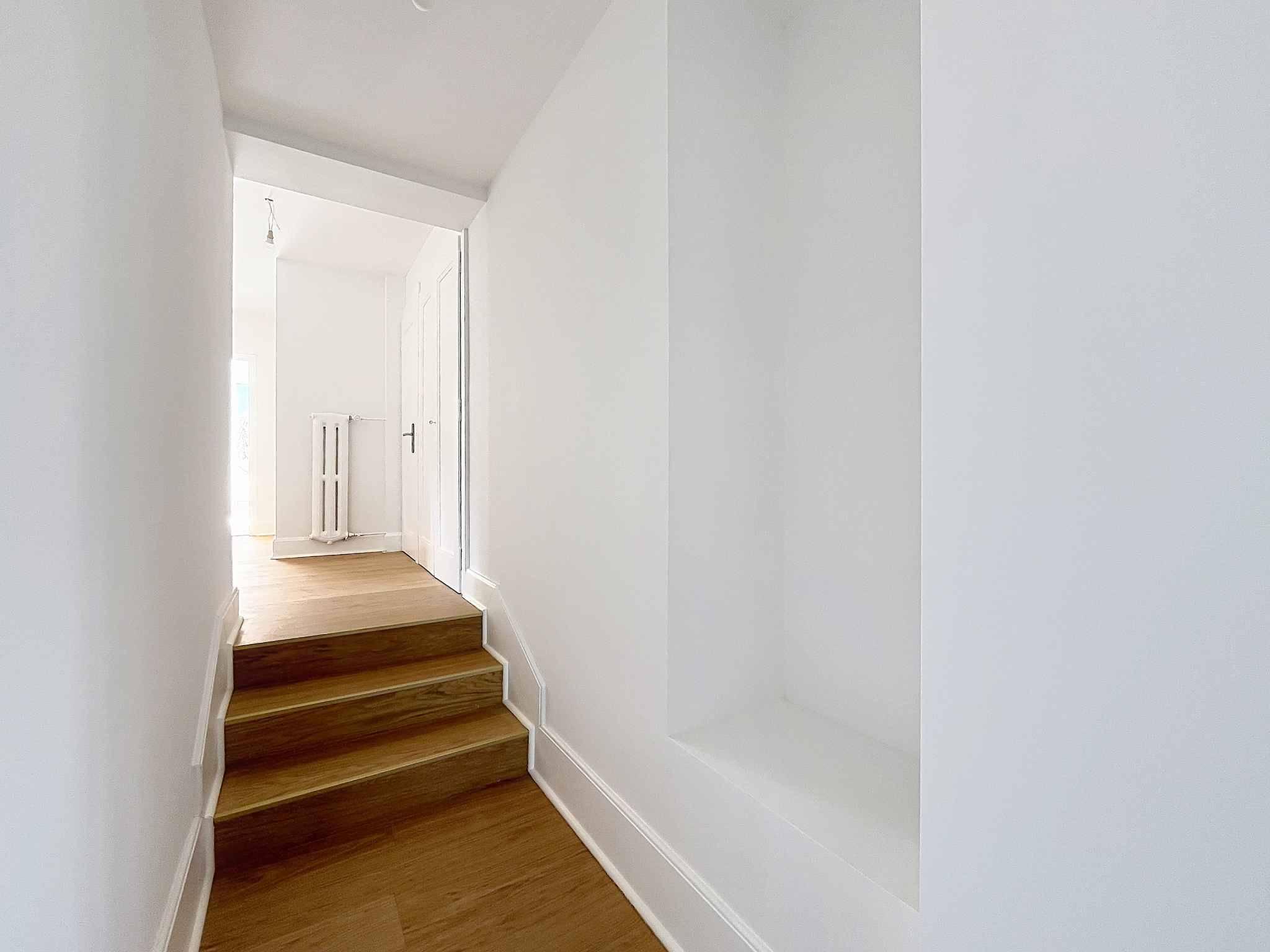 - Un grand corridor avec escaliers et armoire murale
