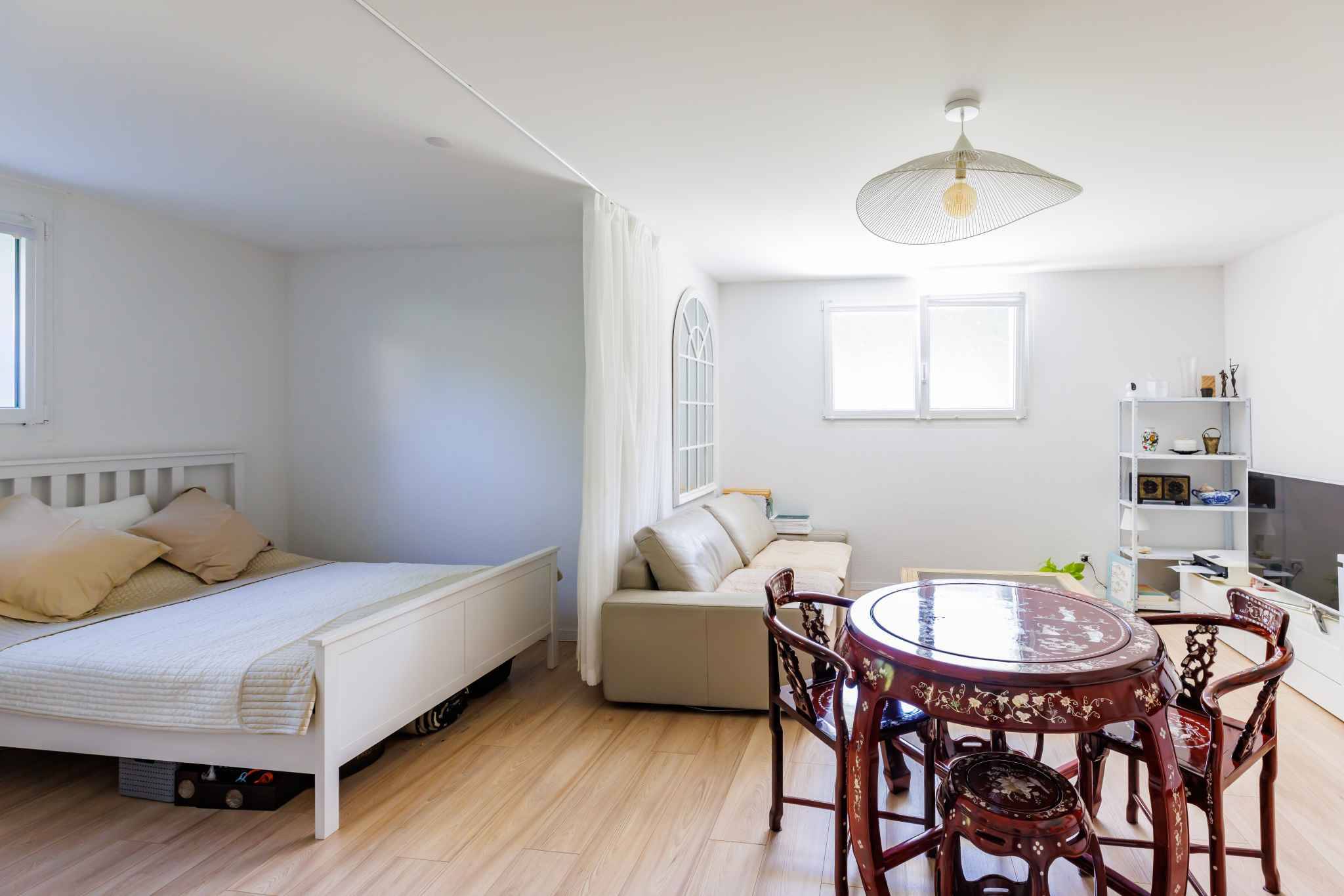 Entrée avec armoire murale, séjour/salle à manger, cuisine agencée ouverte, deux chambres, salle de douche/WC avec raccordements (reprise du lave -linge possible), escalier menant à un studio composé d'une grande pièce à vivre, espace nuit et salle de douche/WC (accès au studio également par une entrée indépendante)