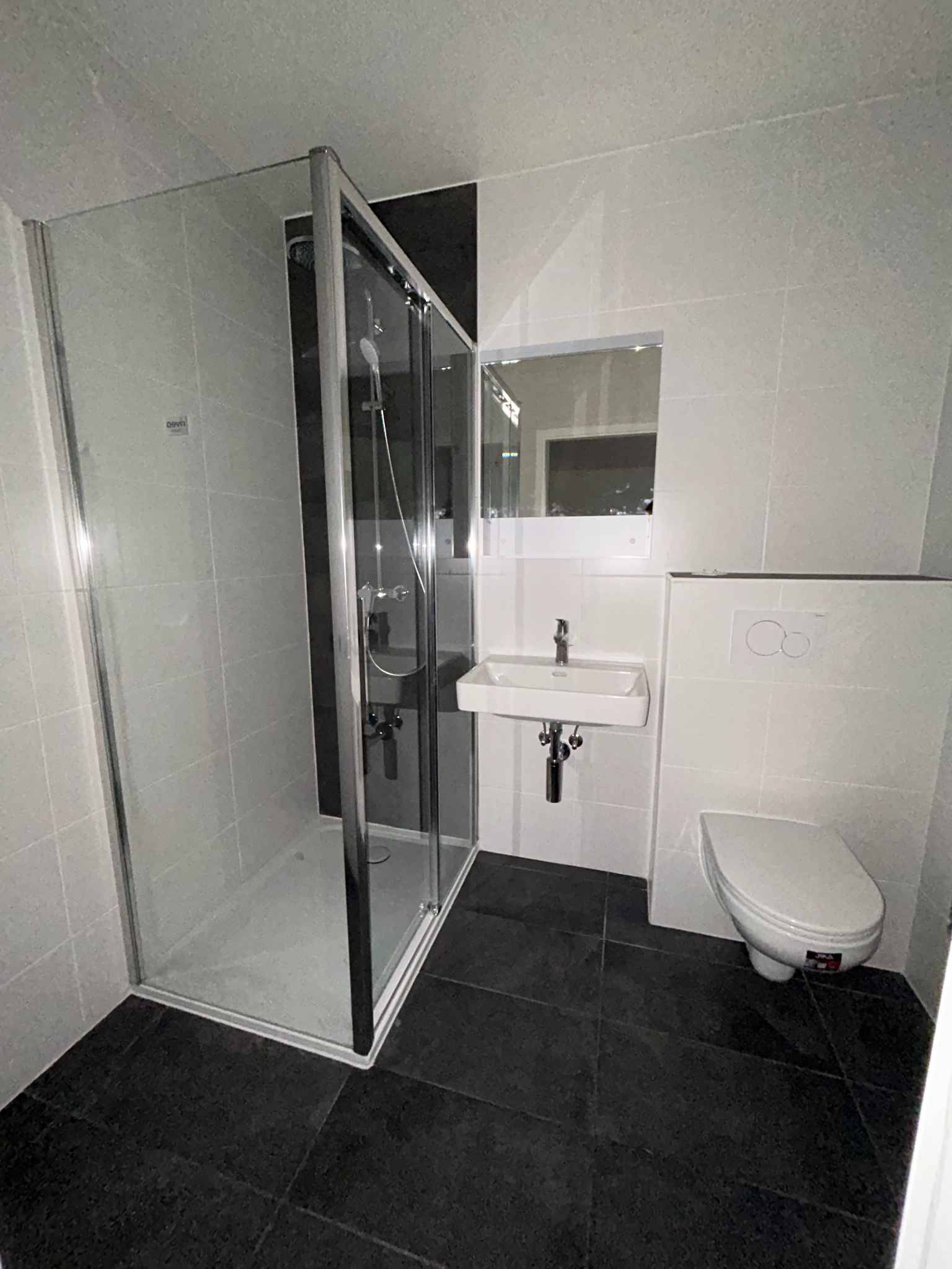 Une salle de douche neuve moderne, avec arrivée d'eau pour le lave linge