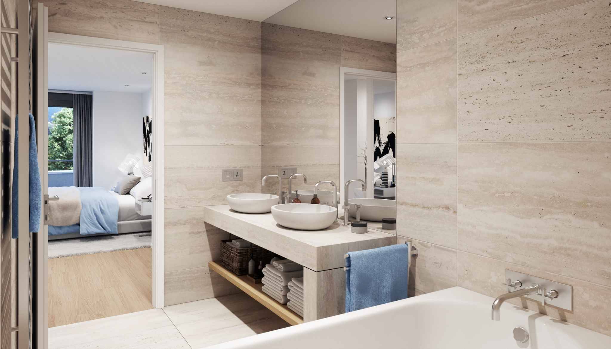 Suite parentale (19,1 m²) avec dressing intégré et salle de bains attenante équipée de deux vasques et d’une baignoire.