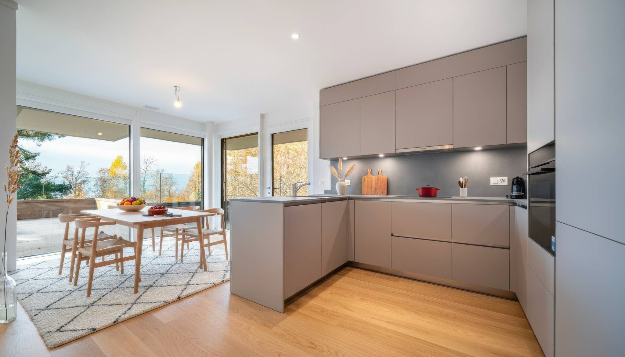 - Cuisine moderne et entièrement agencée ouverte sur séjour donnant accès à une terrasse d'environ 66 m2