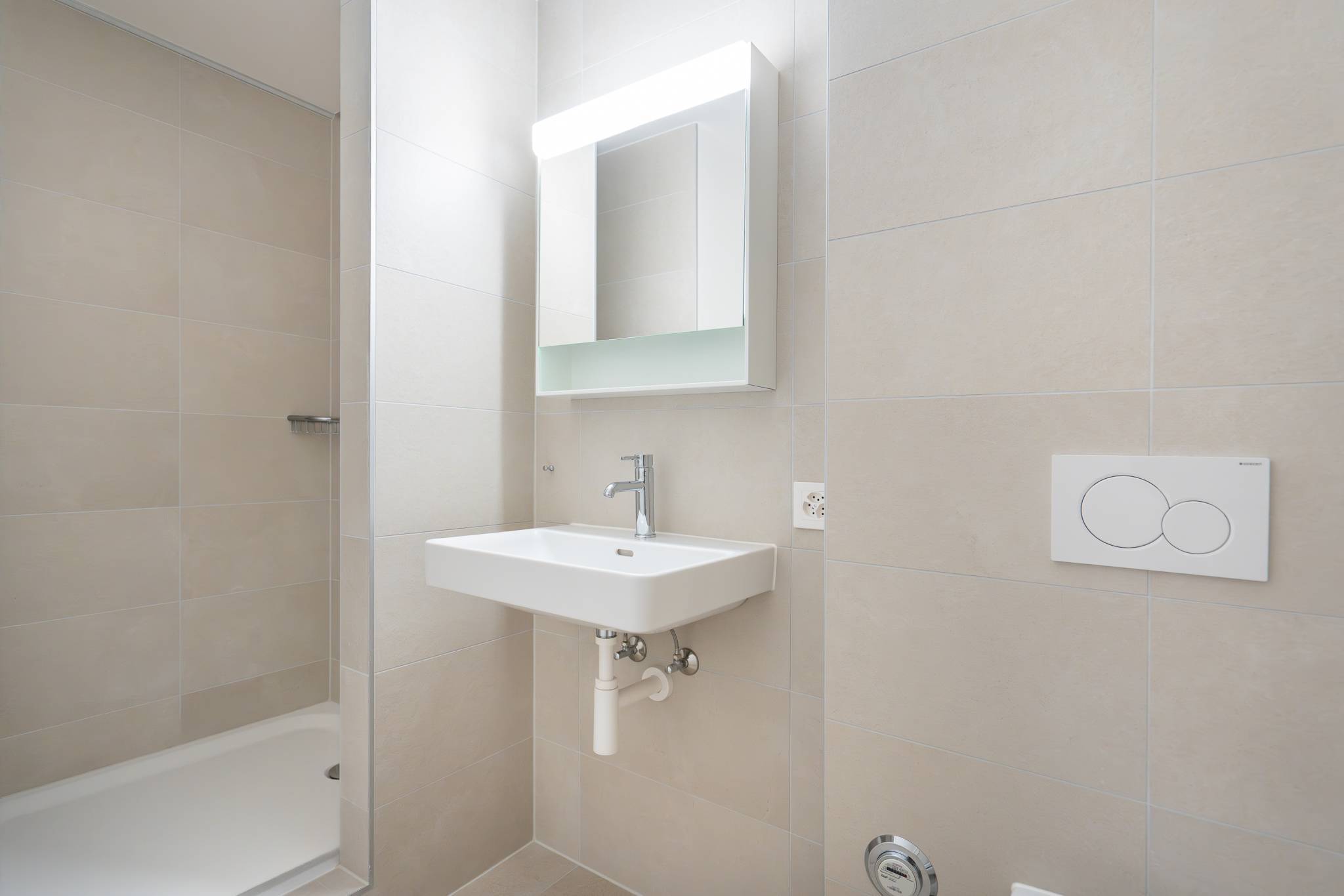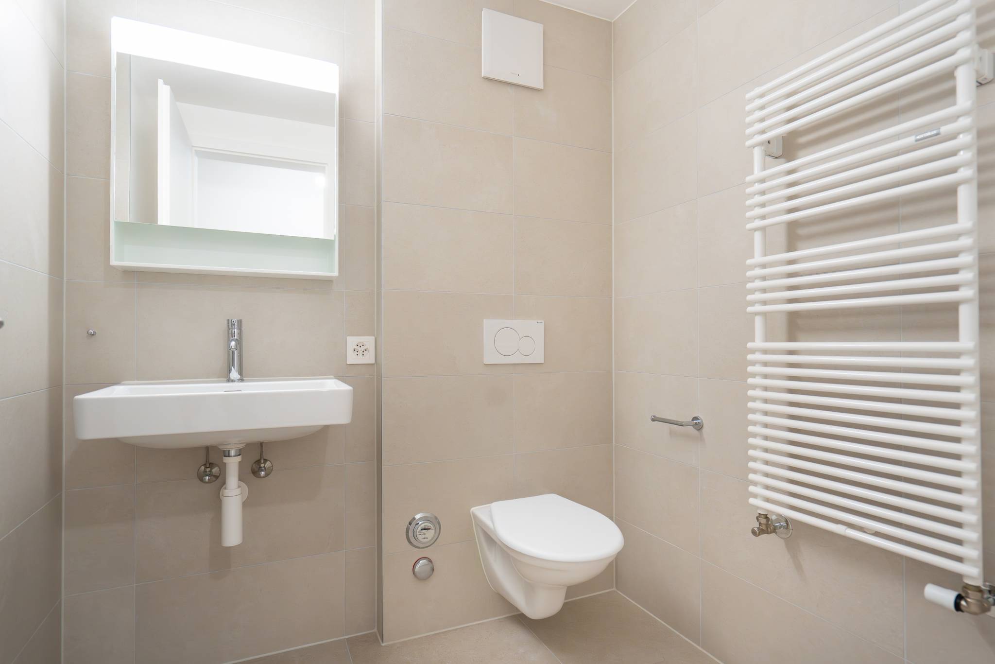 Salle de douche moderne avec WC et chauffe-serviettes.
