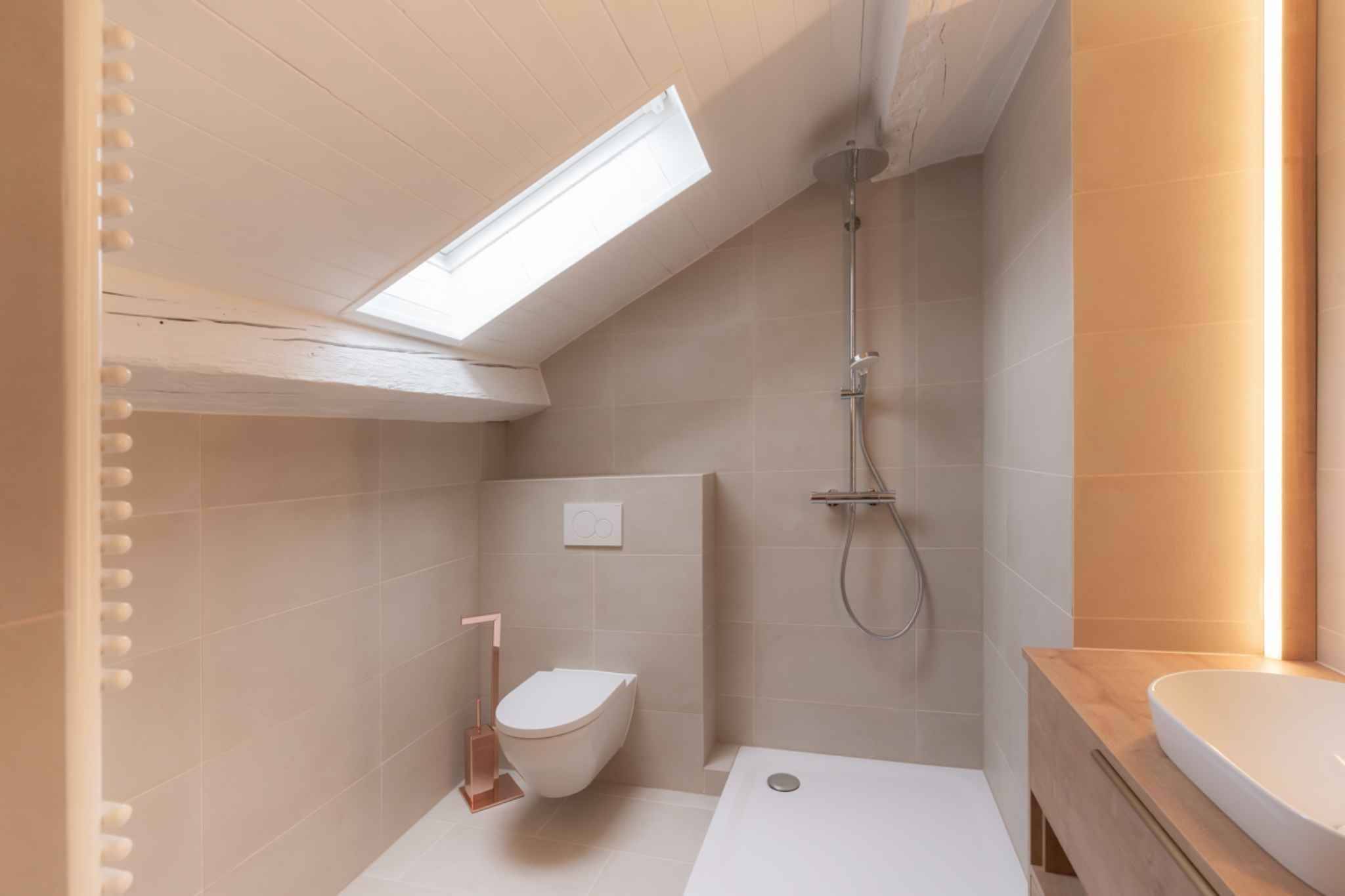 Étage : Chambre spacieuse et salle de douche entièrement rénovée.