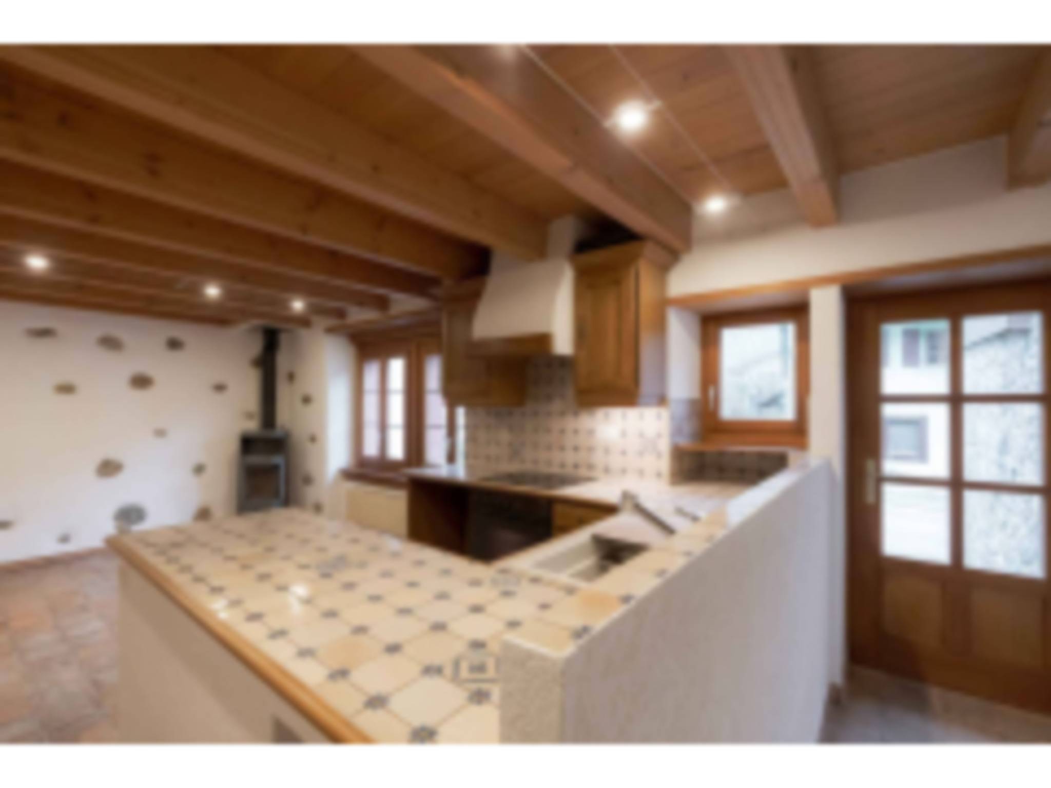 Rez-de-chaussée : Cuisine équipée ouverte sur le salon/séjour avec cheminée.