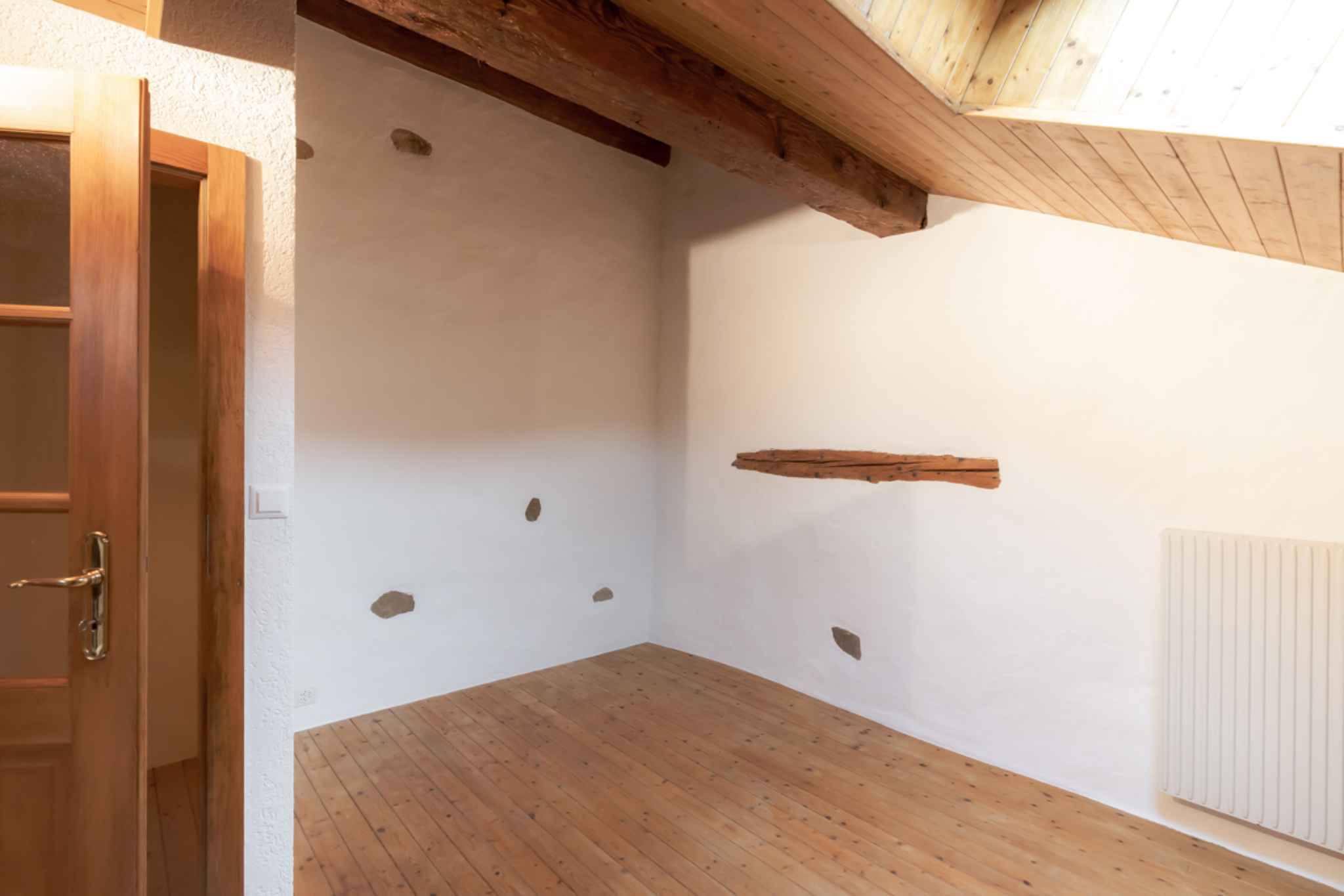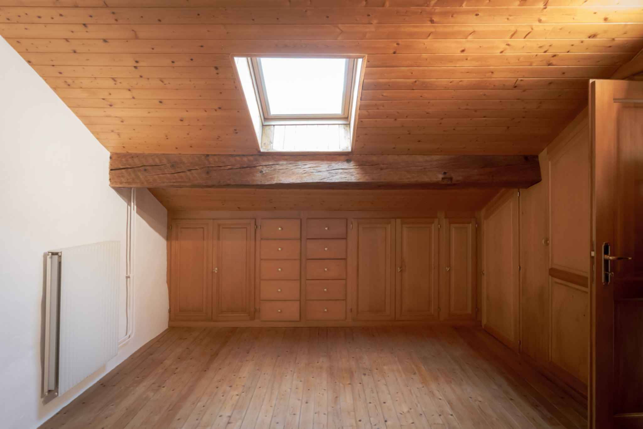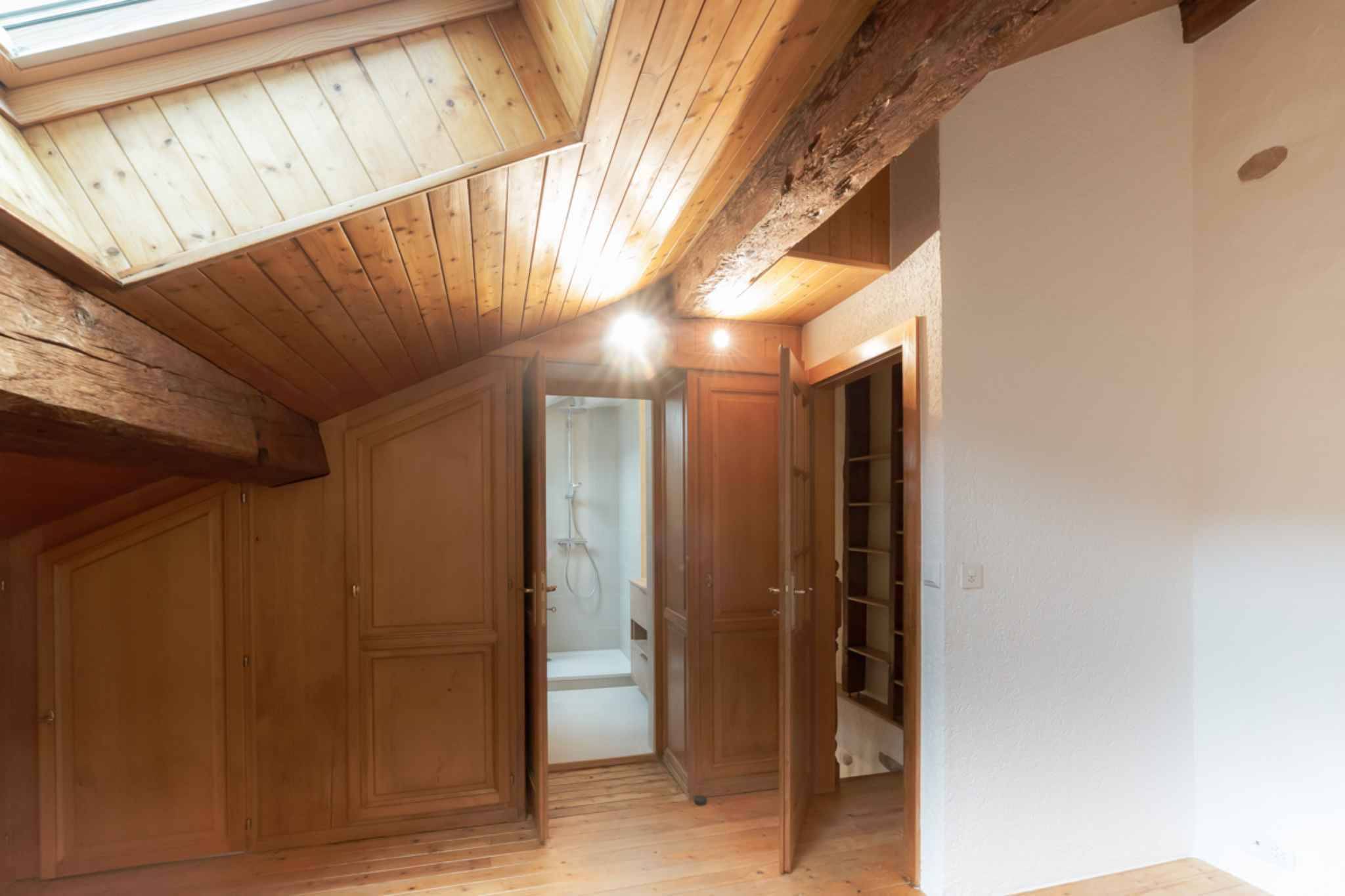 Étage : Chambre spacieuse et salle de douche entièrement rénovée.