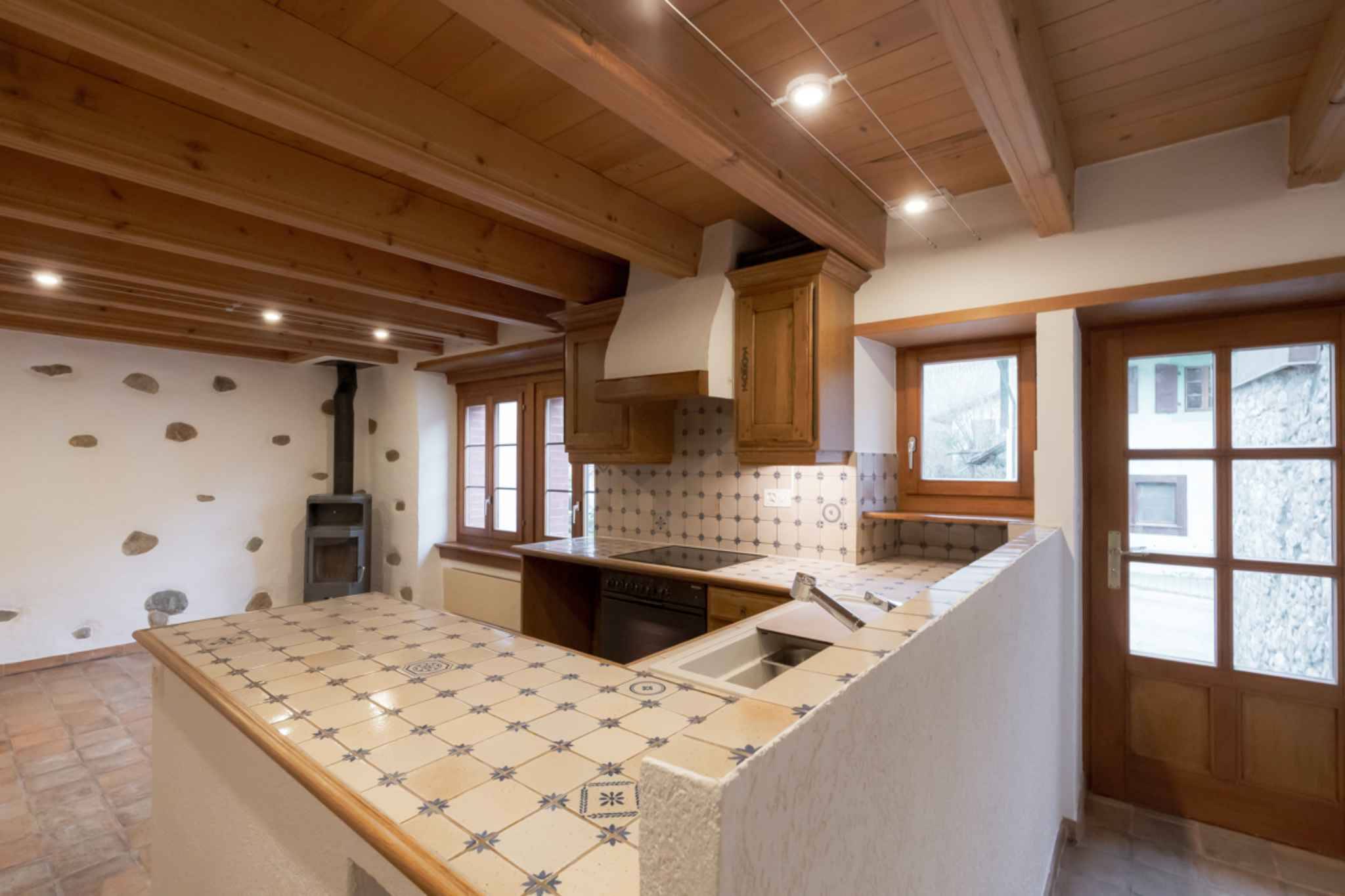 Rez-de-chaussée : Cuisine équipée ouverte sur le salon/séjour avec cheminée.