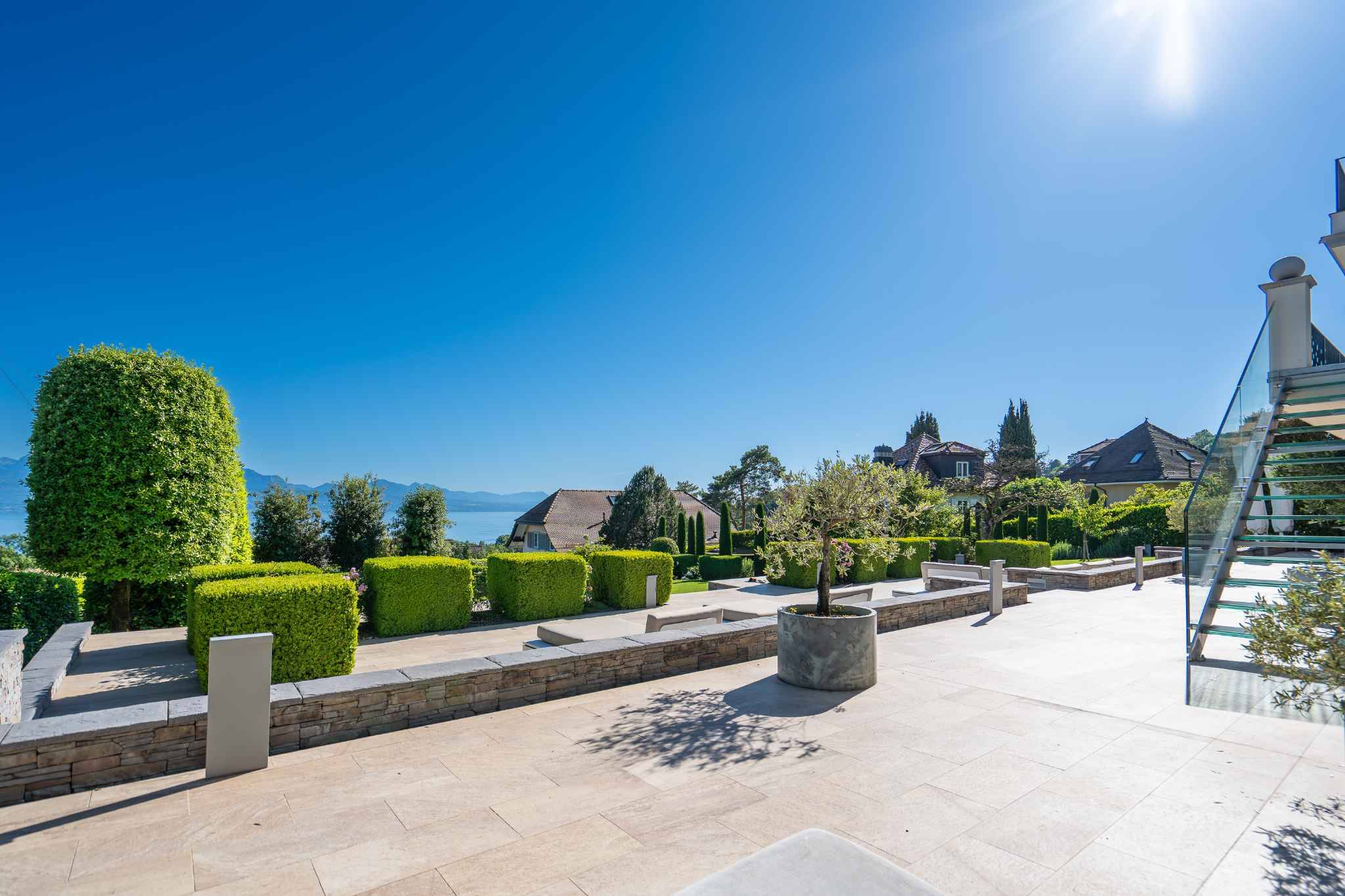 Les extérieurs, s’étendant sur un terrain de plus de 2’000 m², ont fait l’objet d’un aménagement paysager soigné, avec une succession d’espaces à vivre : terrasses intimistes, végétation choisie, et zones de détente pensées pour savourer chaque saison.