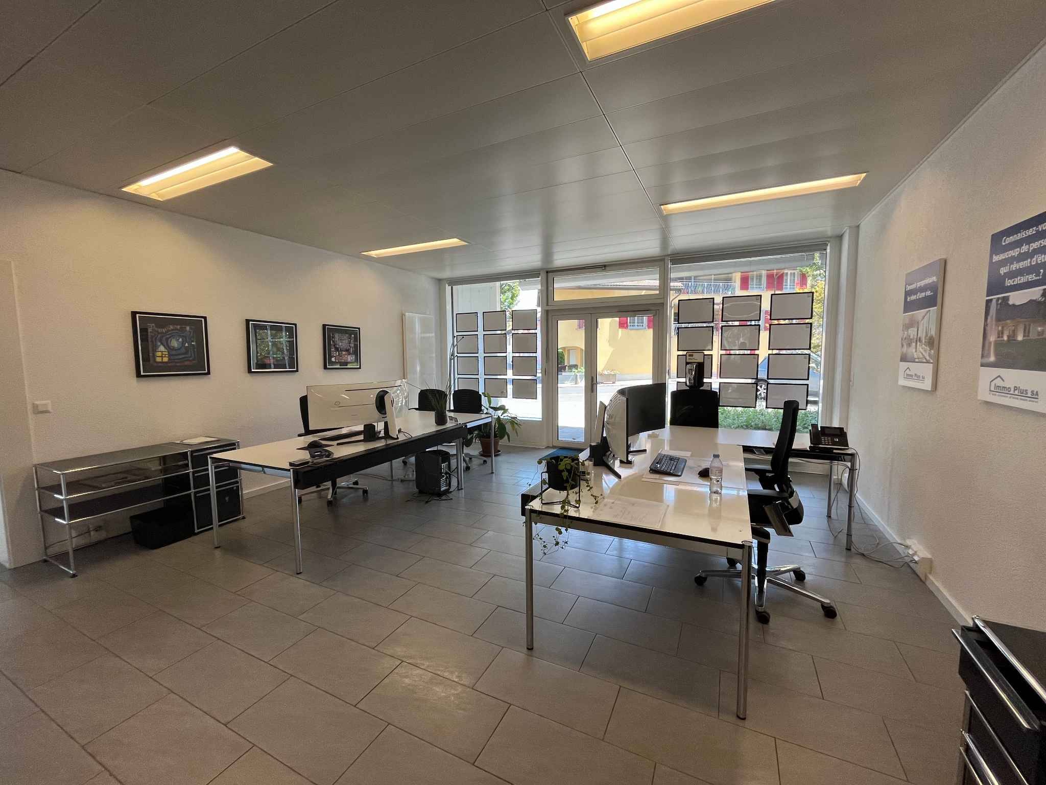 Belle surface de plain-pied dans un espace lumineux avec grandes vitrines sur la route principale.