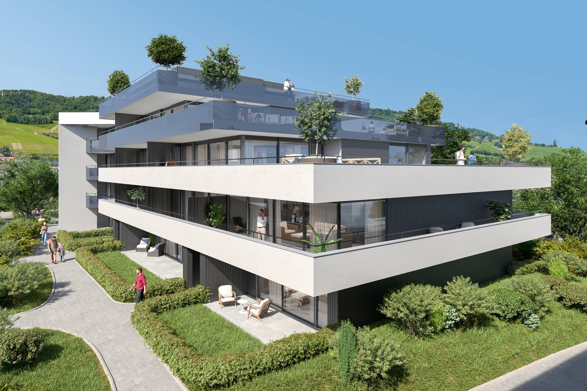 La résidence propose des appartements allant du 1.5 pièces au 5.5 pièces en attique ou avec jardin, offrant de magnifiques vues sur le lac et les Alpes.
