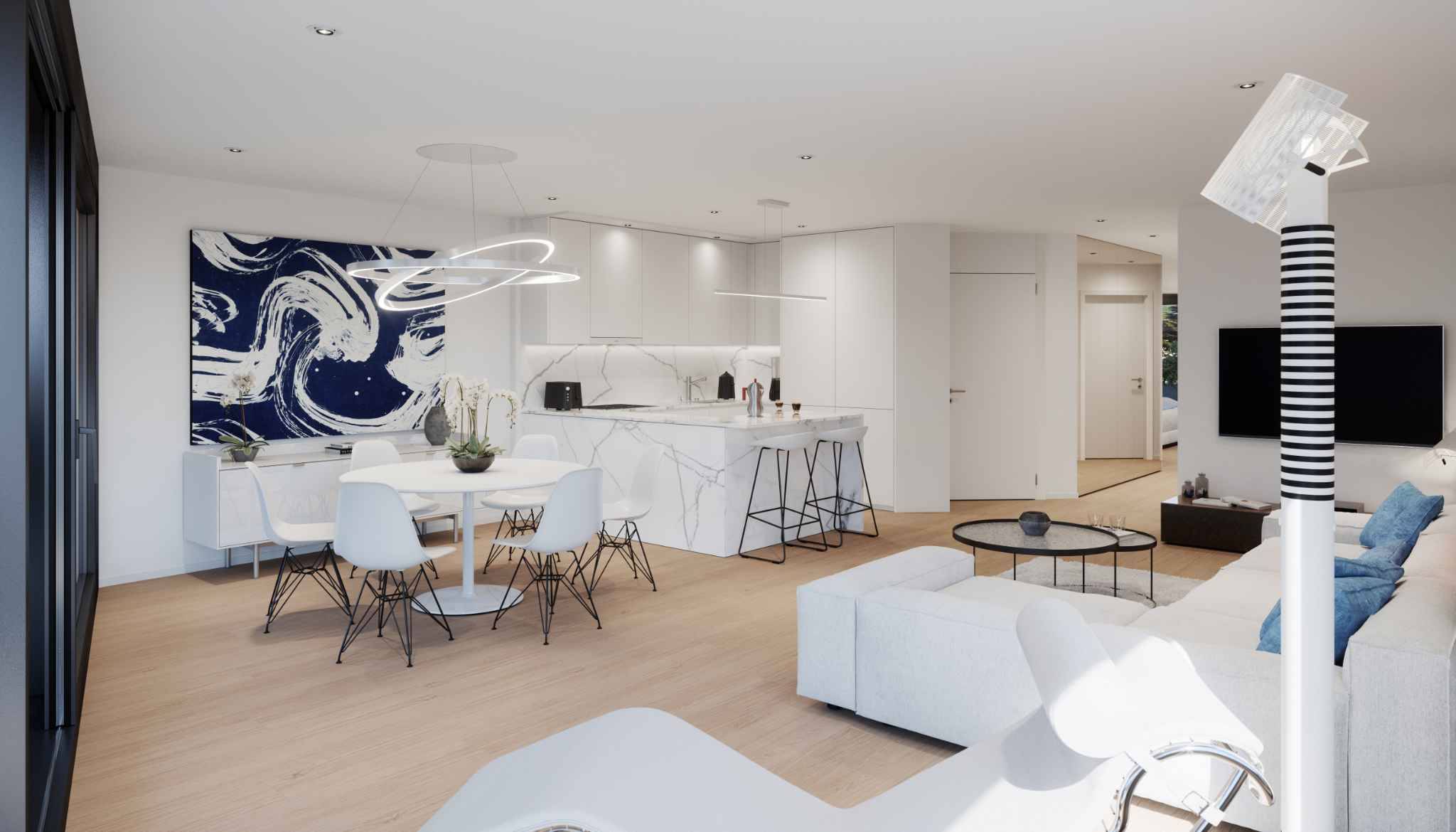 - Vaste espace de vie de 36 m² comprenant séjour et cuisine ouverte entièrement équipée avec îlot central, ainsi qu’une buanderie avec emplacement pour colonne de lavage