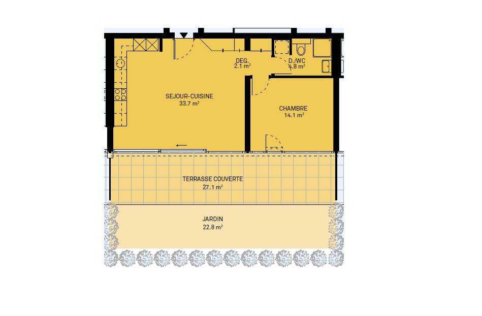 Une entrée donnant sur un séjour / cuisine ouverte de plus de 33m2 avec accès à la terrasse couverte et au jardin, une salle de douche avec arrivées d'eau pour la colonne de lavage, une chambre à coucher avec un accès extérieur. Une cave complète ce bien.