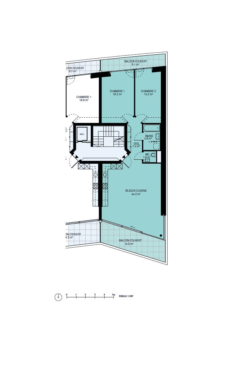 Les appartements du rez-de-chaussée ont un jardin privatif et tous les logements bénéficient de terrasses ou balcons. 11 attiques avec vue panoramique et des rooftop terrasses offrent jusqu’à 249m2 de surface pondérée.