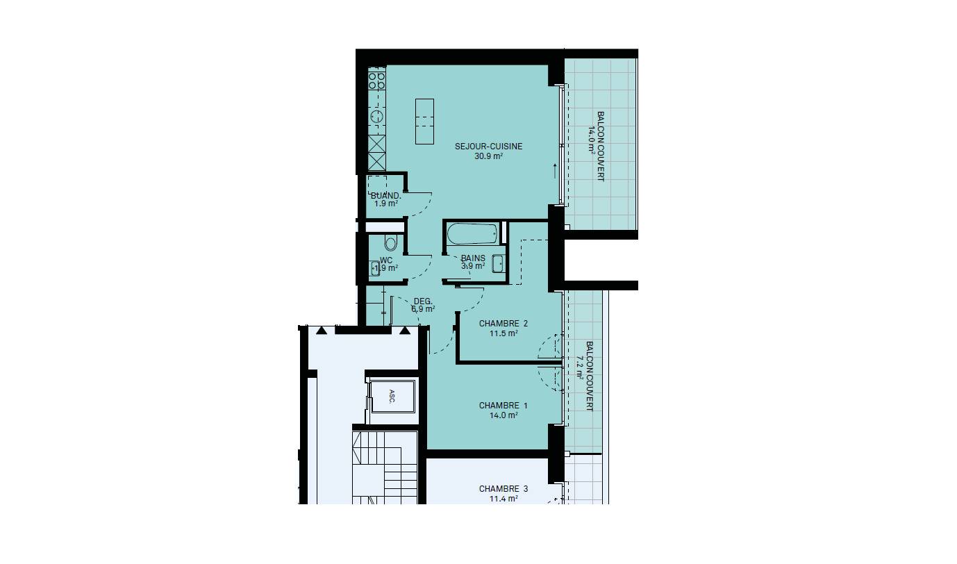 Les appartements du rez-de-chaussée ont un jardin privatif et tous les logements bénéficient de terrasses ou balcons. 11 attiques avec vue panoramique et des rooftop terrasses offrent jusqu’à 249m2 de surface pondérée.