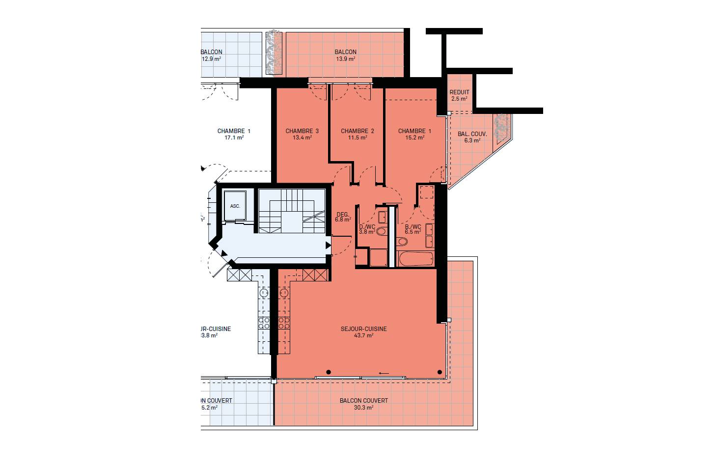Un hall d'entrée avec armoire murale, un grand séjour / cuisine ouverte de plus de 43m2 avec accès au premier balcon couvert. une salle de douche, deux chambres à coucher avec accès à un balcon, une chambre parentale avec une salle de bains attenante avec arrivée d'eau pour la colonne de lavage. La chambre parentale dispose d'un accès au deuxième balcon couvert ainsi qu'au réduit. Une cave complète ce bien.
