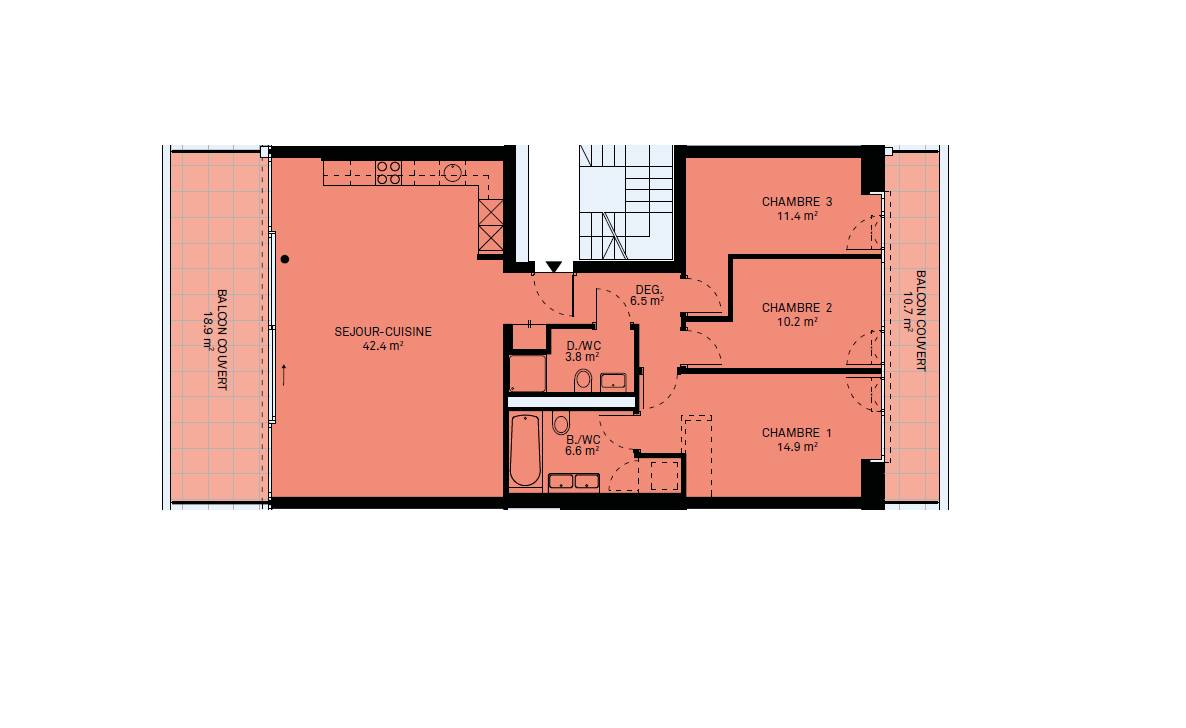Un hall d'entrée avec armoire murale, un séjour / cuisine de 42m2 avec accès à un premier balcon couvert de 18.9 m2, une salle de douche/WC, deux chambres à coucher et une chambre parentale avec salle de bain attenante avec arrivées d'eau pour la colonne de lavage. Les trois chambres ont accès au deuxième balcon couvert de 10.7 m2.
