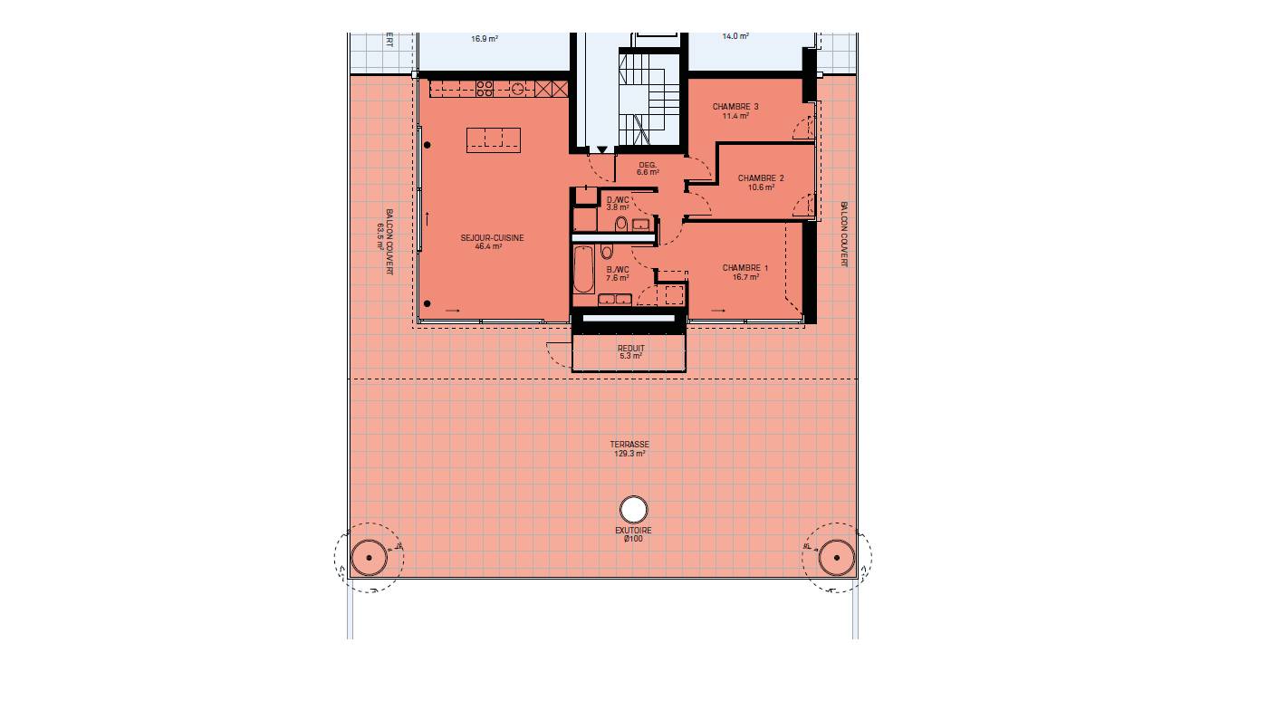 Un hall d'entrée avec armoire murale, un grand séjour / cuisine ouverte de plus de 46m2 avec accès au balcon couvert et à la terrasse, une salle de douche/WC, deux chambres à coucher et une chambre parentale avec salle de bain attenante avec arrivées d'eau pour la colonne de lavage, un réduit. Toutes les chambres ont accès à l'extérieur. Terrasse de 129.3 m2 et balcon de 69 m2.