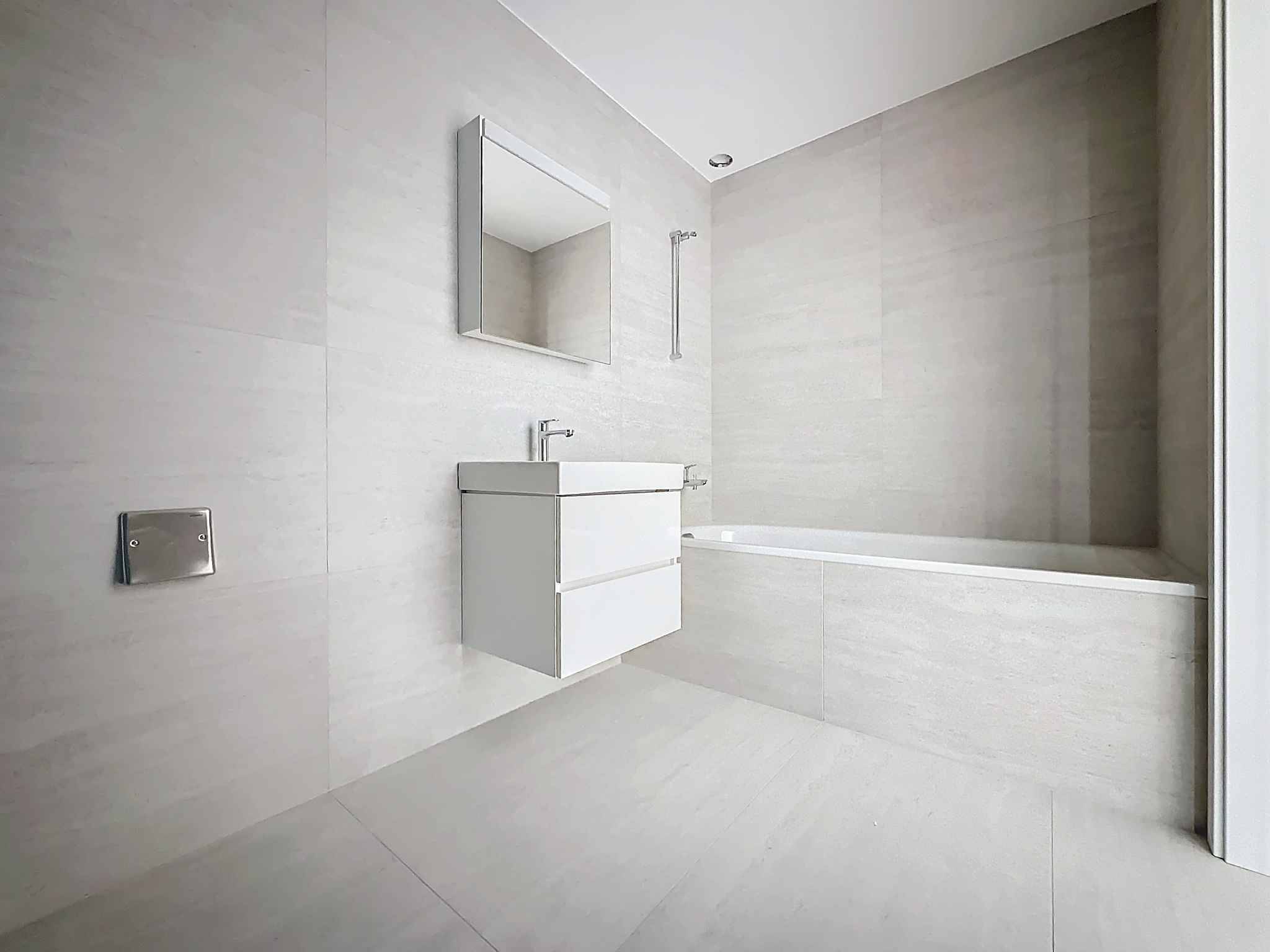 Hall d'entrée avec armoires murales, cuisine ouverte sur le séjour de 44m2 donnant accès au balcon de 15.9m2, un WC séparé, une salle de bains avec raccordement pour la colonne de lavage, deux chambres à coucher avec accès au second balcon de 9.1m2.